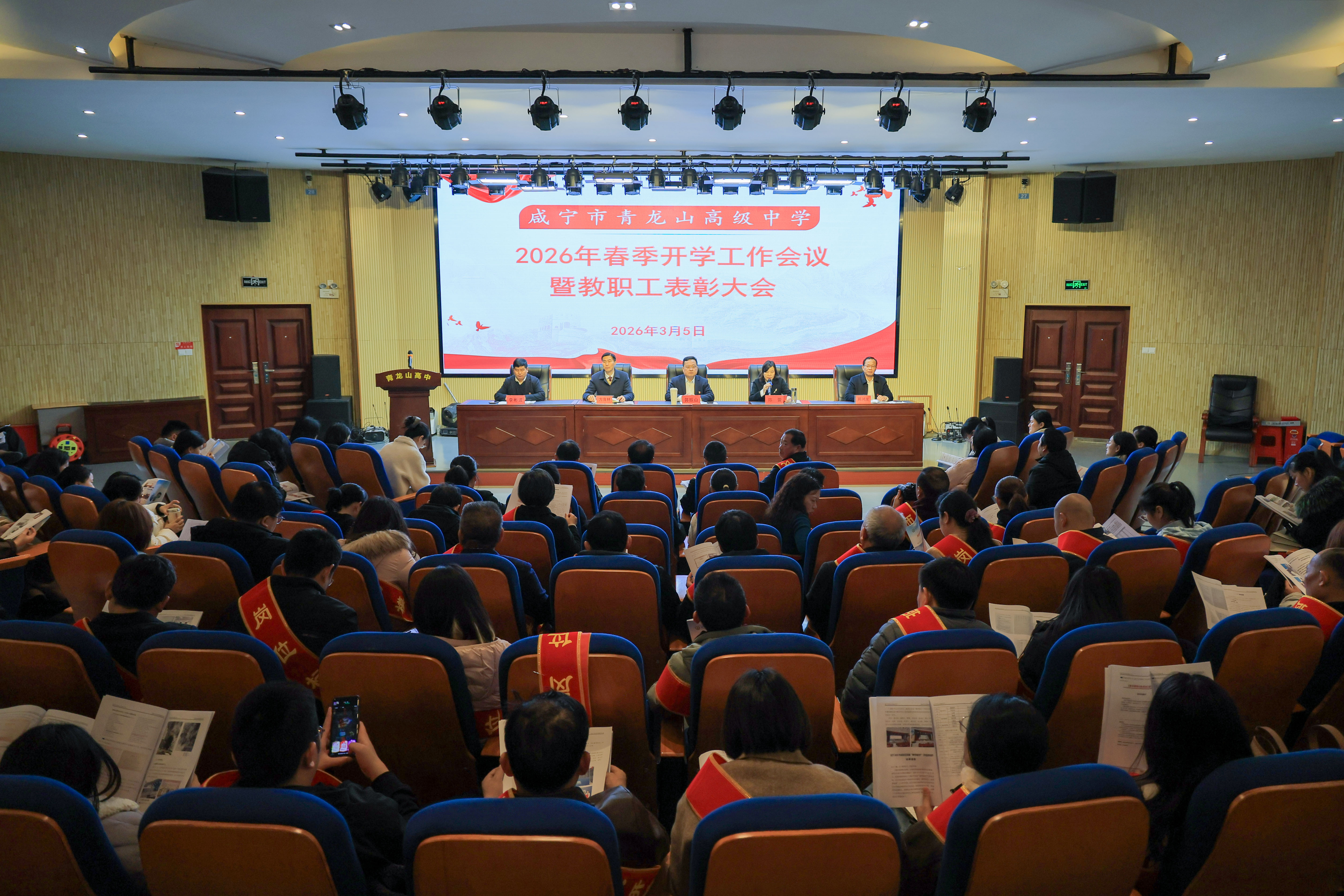 3月5日,咸宁市青龙山高中举行2026年春季开学工作暨教职工表彰大会,全校教职工参会,总结过往成绩、表彰先进典型、部署新学期工作。
