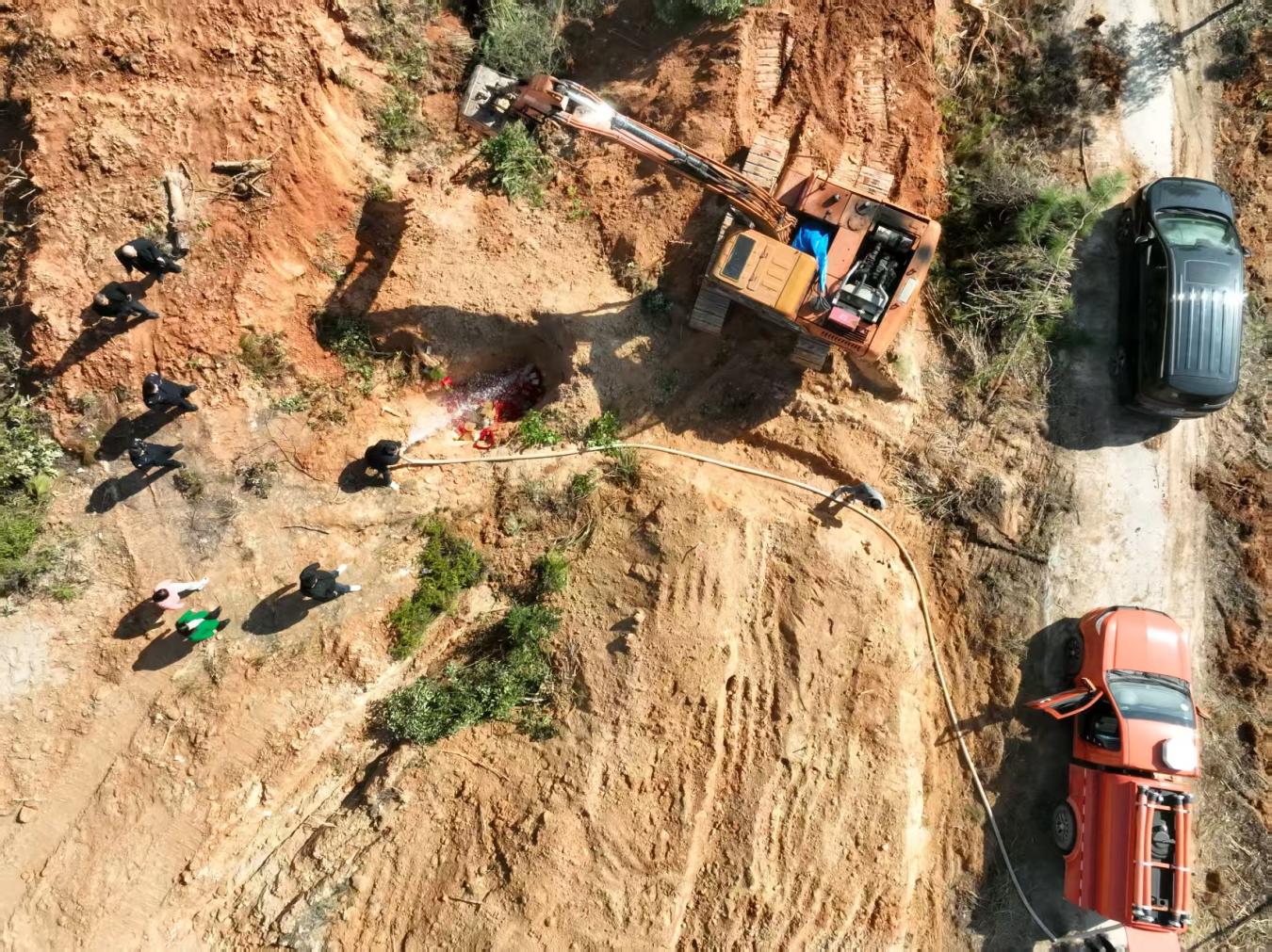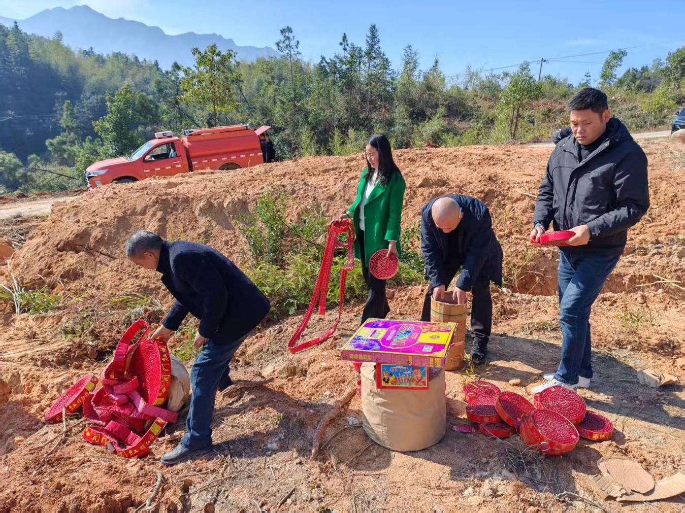 销毁现场,工作人员严格按照安全规范,将待销毁的非法烟花爆竹有序卸车、分类堆放。伴随着机器轰鸣声,专业人员采取水浸浇透与深挖掩埋相结合的方式,对这批烟花爆竹进行了彻底销毁。整个作业过程井然有序,确保了对周边环境和人员绝对安全。
