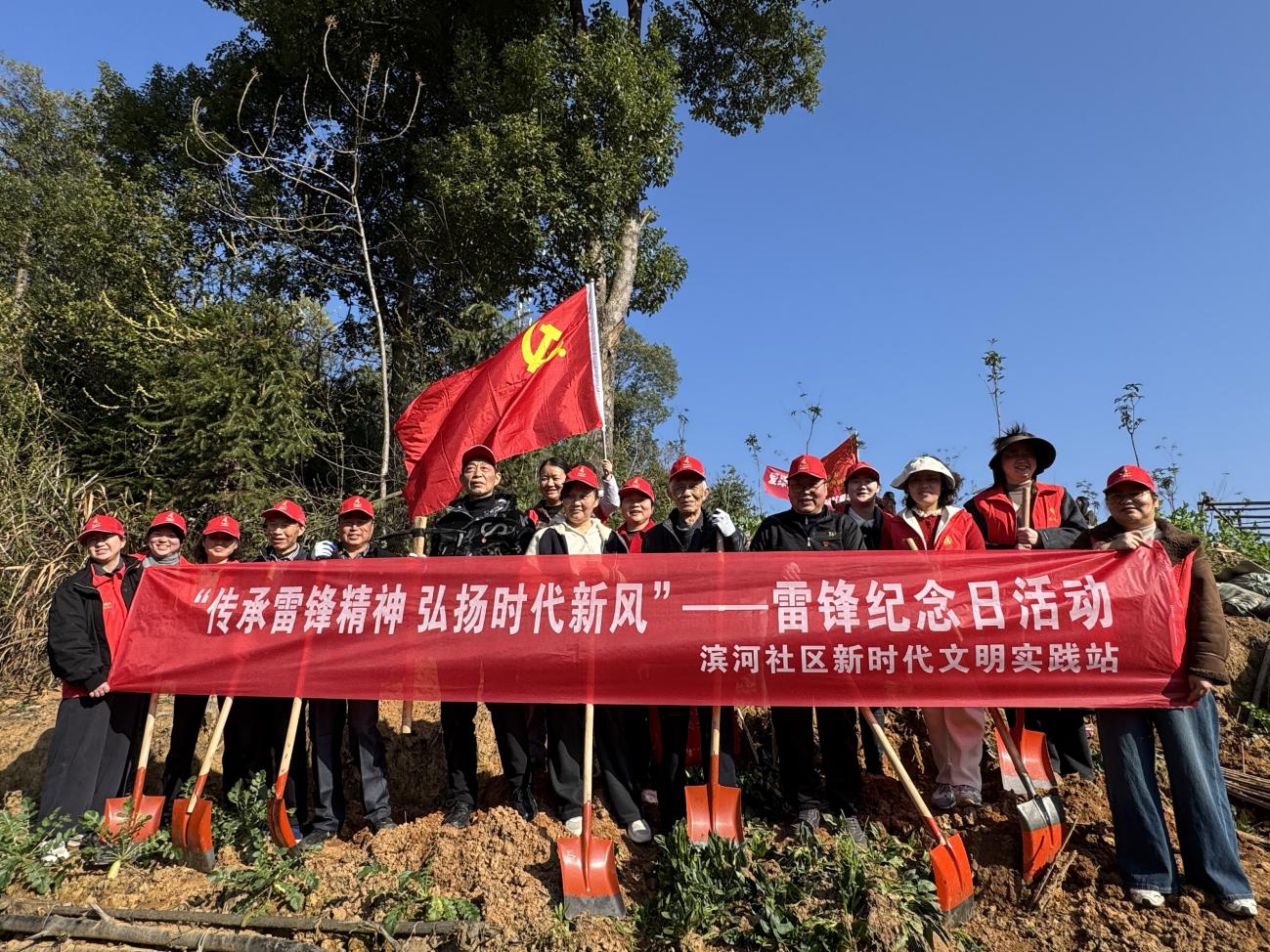 活动现场,“志愿红”与“生态绿”交相辉映,一派热火朝天的劳动景象。来自南昌路社区唐光友民兵连的30余名队员身着迷彩服,以军人的严谨作风投入植树,挥锹铲土、扶苗培土、提水浇灌等环节一气呵成,大家动作娴熟、配合默契,高效完成植绿任务,成为山间一道独特风景线;温泉社区的志愿者们手持铁锹、水桶、修剪工具,分为植绿、护绿两组,既栽种桂花、酸枣树等适配本地气候的苗木,又对往年栽种的桂花林开展杂草清理、枯枝修剪、松土施肥等精细化养护;滨河社区组织30余名党员组成先锋服务队,有的挥锹铲土,挖坑扶苗,有的培土压实,固定植株,有的提水浇灌,呵护新苗。87岁的老党员黄爹爹感慨道:“种下一棵树,就是传承一份雷锋精神,为后代留一片绿。”