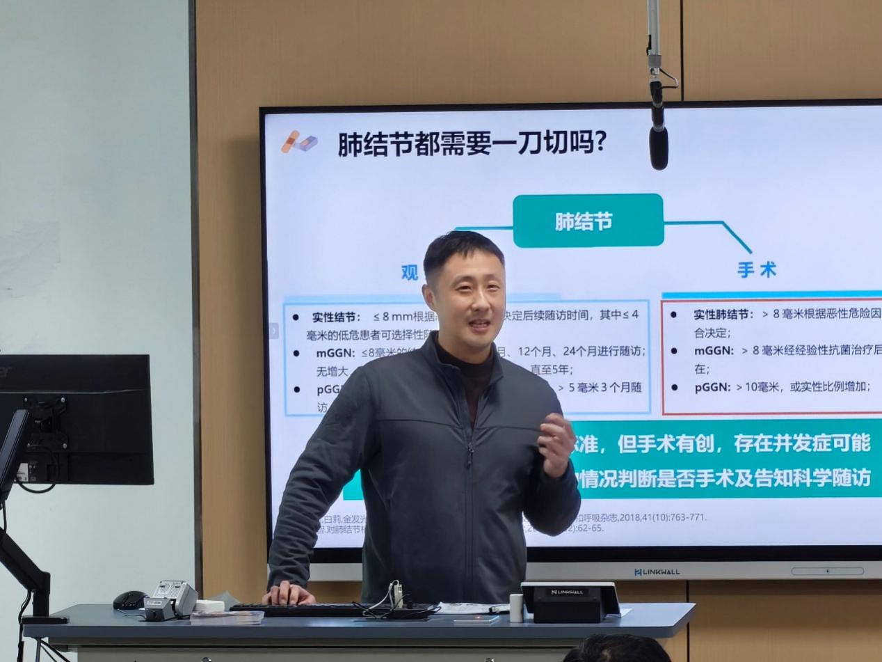 活动现场,韩琦博士结合临床一线诊疗经历,以“肺结节与肺癌防治”为核心主题,直面大众“肺结节等同于肺癌”的认知误区。通过详实的病例分析、清晰的肺部CT影像图,系统讲解肺结节的分类特征、诊疗流程、定期筛查标准及主流治疗手段,针对“肺结节是否需要一刀切”等群众关切的热点问题,进行细致解答,用专业知识消除大众防癌焦虑。