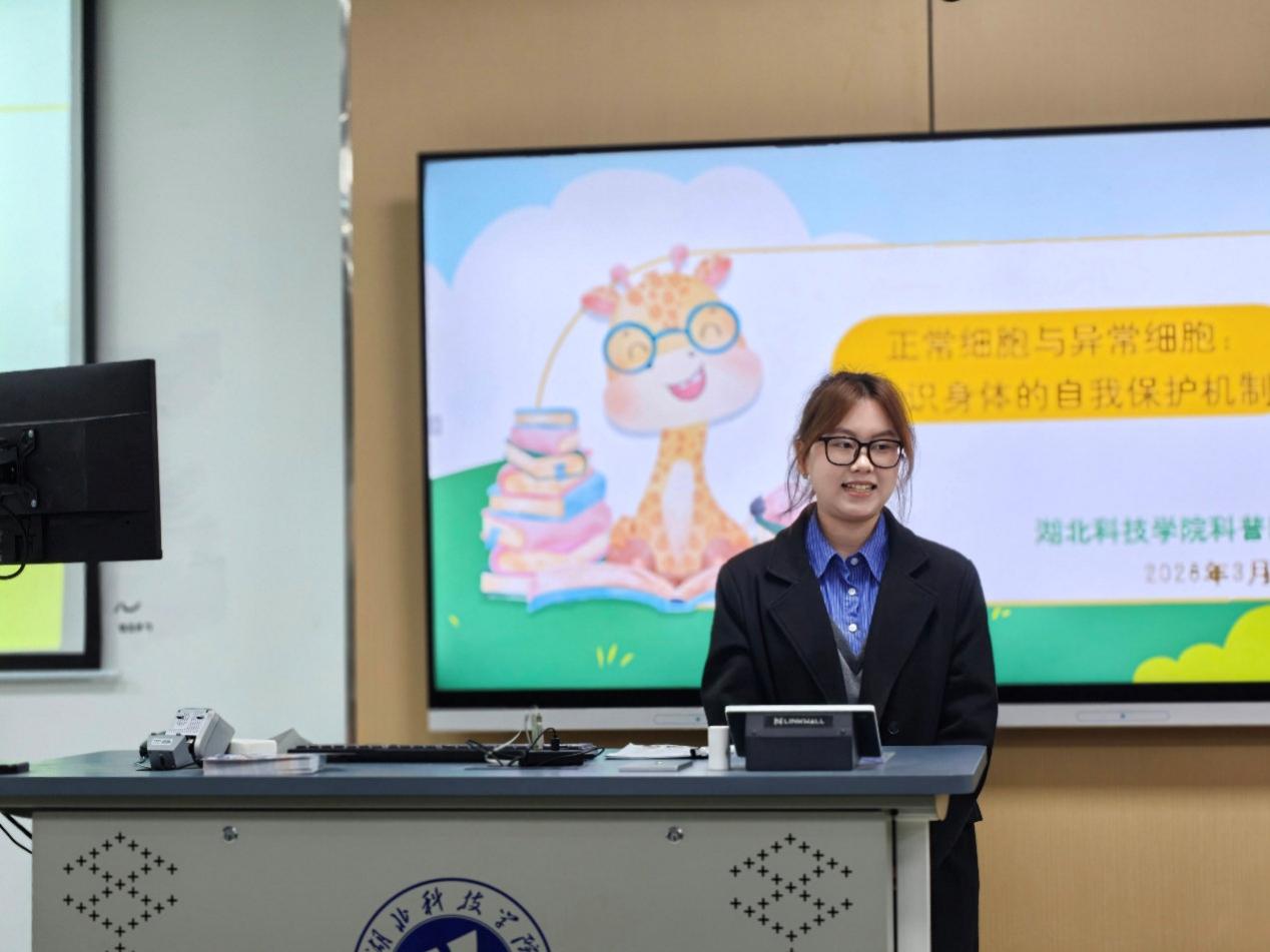 随后,湖北科技学院25级影像专业学生杨彧涵带来趣味科普分享,以生动活泼的形式解读红细胞、白细胞及异常细胞的相关知识,倡导规律作息、健康饮食的生活方式,引导年轻群体从日常细节关注身体健康。现场还设置了宣传资料发放环节,让科普知识触达每一位在场师生。