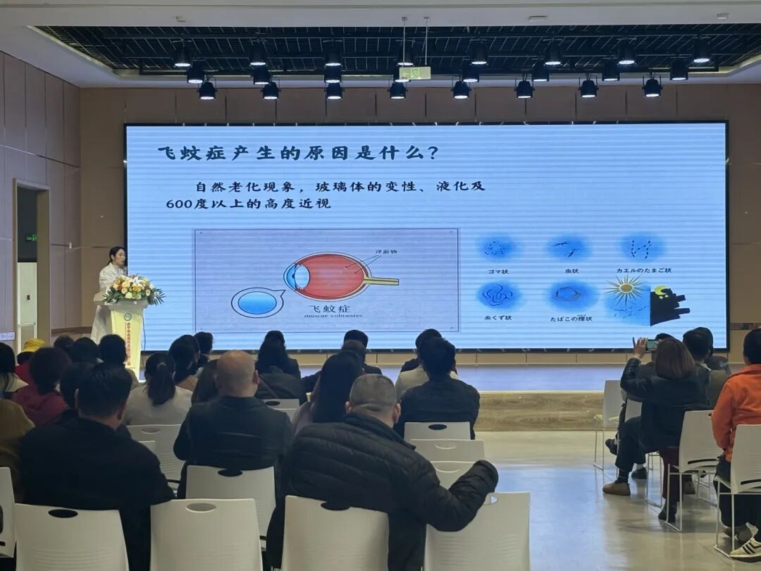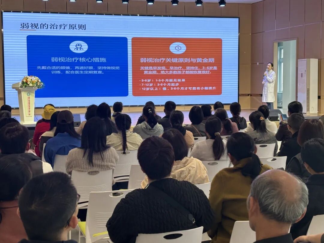 讲座现场,张主任凭借丰富的临床经验,将原本晦涩难懂的眼健康知识转化为平实易懂的语言,覆盖了全生命周期的视力需求。在幼儿阶段,重点解读了弱视、斜视、近视的早期信号,强调3 - 6岁是视力发育的黄金期,保护“远视储备”是防控近视的核心关键。这让家长们深刻认识到在孩子幼儿时期保护眼睛的重要性,对于成人阶段,科普了干眼症、飞蚊症等常见眼疾的诱因与防护方法,提醒职场人群避免长时间近距离用眼。这对于现代社会中长时间使用电子设备的职场人士来说,具有很强的指导意义,能够帮助他们更好地保护自己的眼睛。