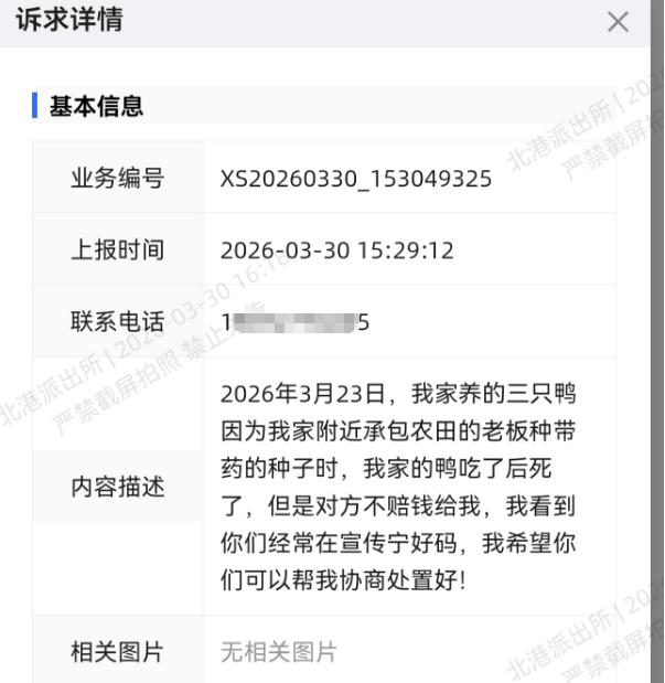 事情要从3月23日说起。在北港镇承包农田的张先生播种了带杀虫药的种子,不料村民黎女士家养的三只鸭子误食后不幸死亡。黎女士心疼不已,多次找到张先生要求赔偿,可张先生却顾虑重重:“要是赔了你,之后其他村民也遇到类似情况,都来找我索赔,我哪承担得起?”双方僵持不下,纠纷迟迟无法解决。