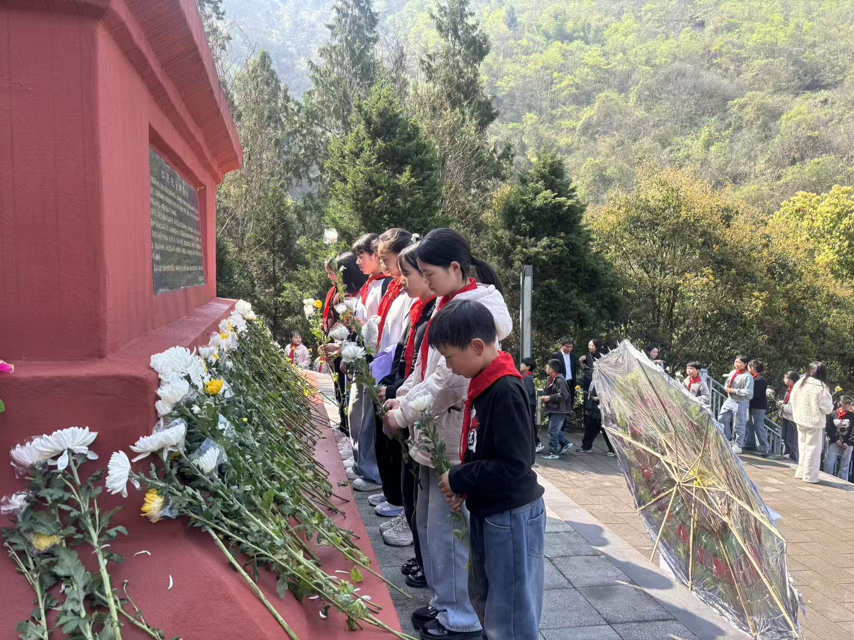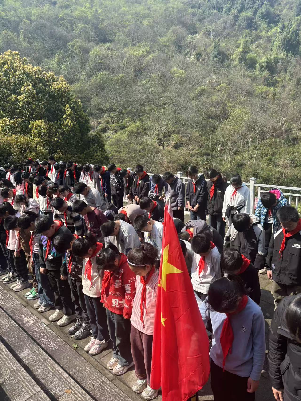在烈士纪念碑前,大队辅导员金老师讲述革命烈士们先进事迹,重温革命烈士精神遗产,缅怀英雄烈士的丰功伟绩,希望全体少先队员以革命先烈为榜样,不断增强意志力、自制力,接过艰苦奋斗的接力棒,以一往无前的奋斗姿态和永不懈怠的精神状态,勇挑重担、苦干实干,在新时代新征程中留下许党报国的青春奋斗足迹。