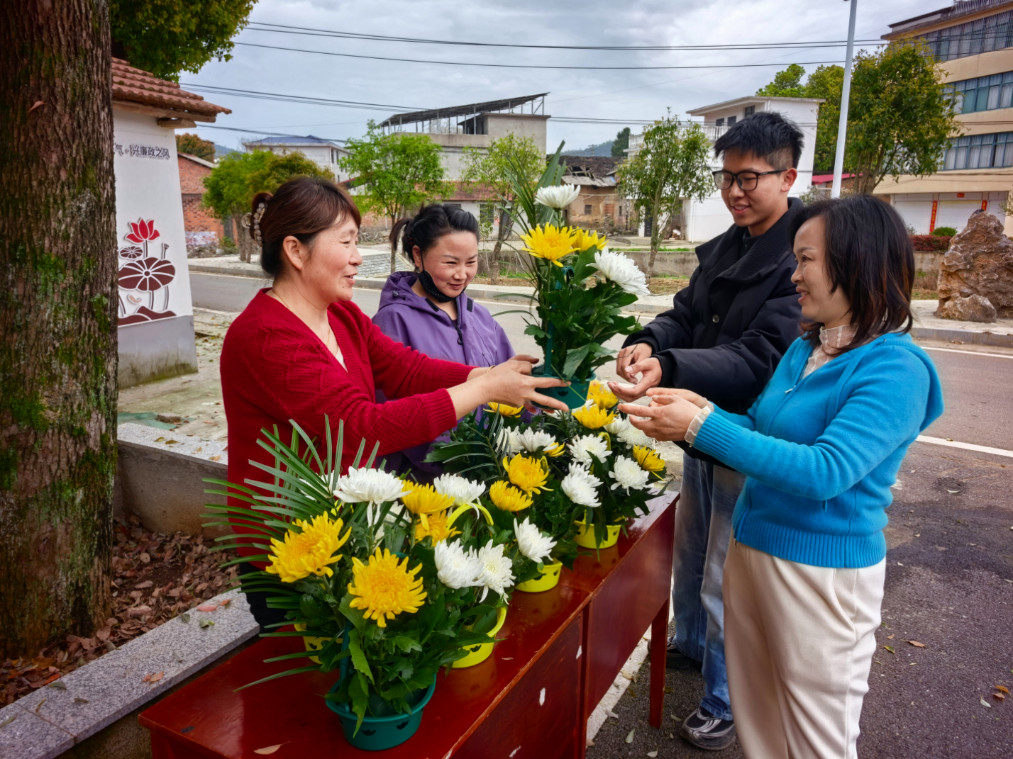 为深入推进移风易俗专项工作,积极倡导文明祭祀新风尚,助力乡村精神文明建设,4月1日,咸安区高桥镇石溪村村委会内一派忙碌祥和的制作景象,村“两委”干部和驻村工作队的同志一起化身“花艺师”,亲手扎制鲜花束,以惠民价格向村民出售,推动绿色低碳祭扫理念落地生根。