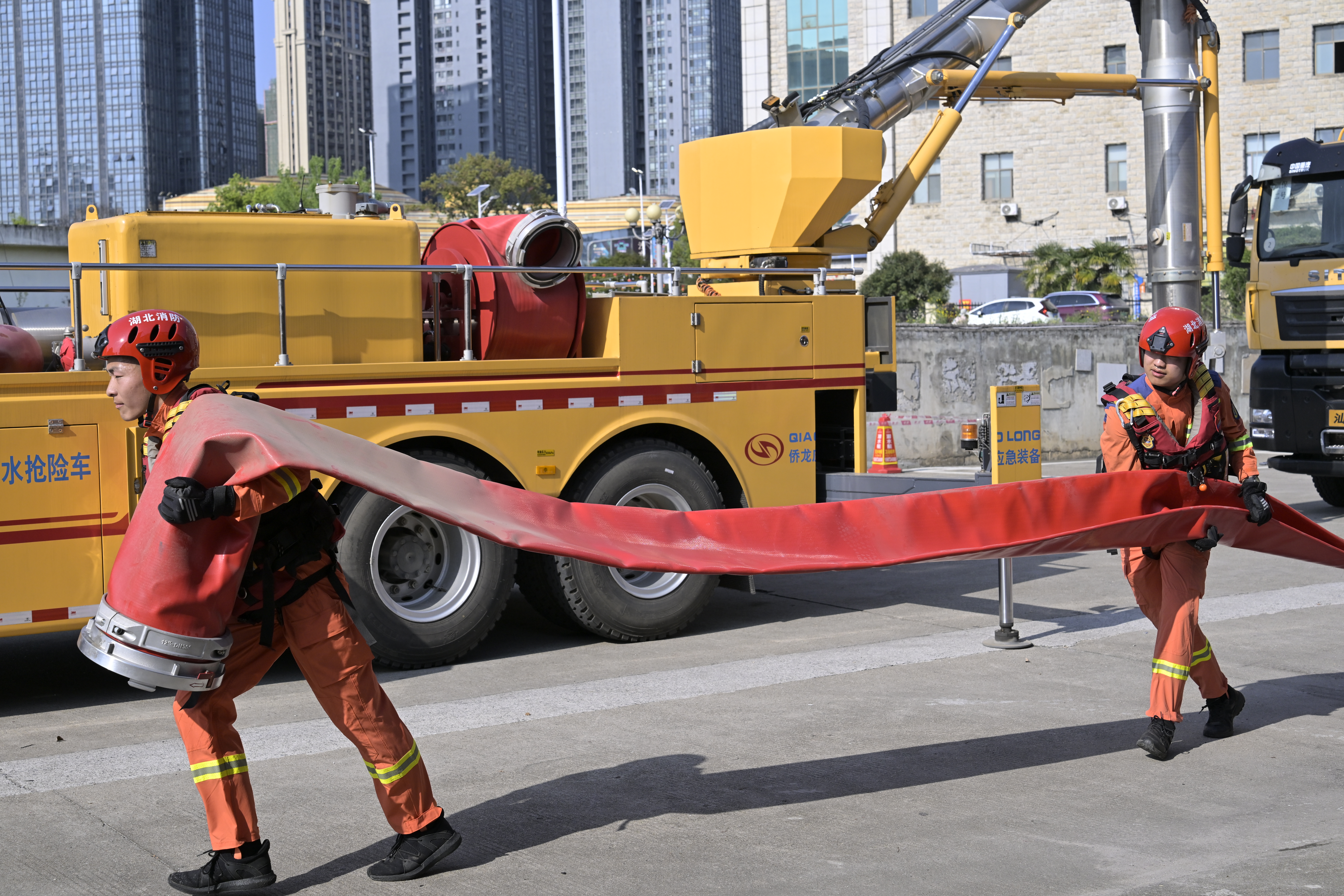 本次演练模拟市城区遭遇暴雨天气,咸宁大道市体育中心发生严重内涝。演练中,市体育中心工作人员巡查发现内涝险情,第一时间向市城防指报告。市城防指根据《城区积水点位抽排设备调配清单》责任分工,立即启动应急响应,通知市消防救援局调配大排量排水抢险车。市消防救援局迅速将多台大排量排水抢险车调至现场,消防抢险人员迅速架设排水设备,启动排水作业,高效开展积水抽排工作。经过1小时紧张作业,体育中心内涝水位下降至安全值,演练圆满结束。