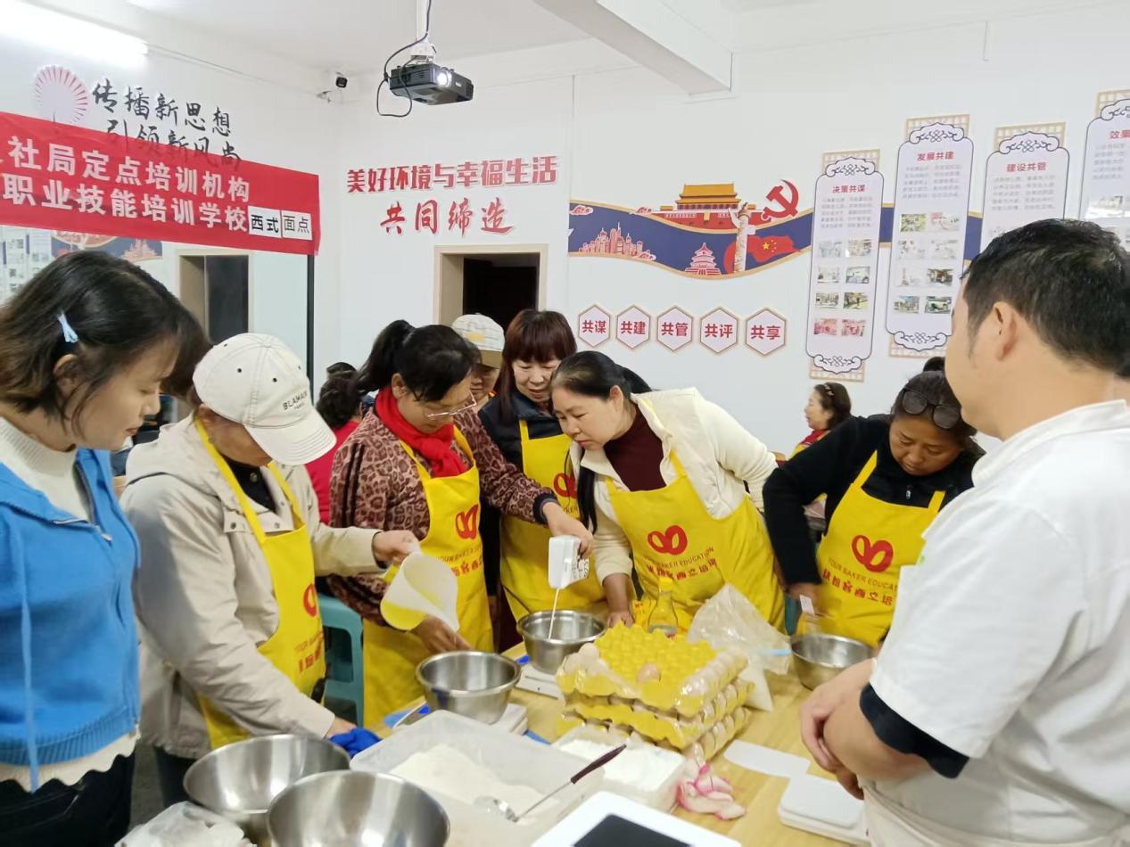 活动现场暖意融融、奶香四溢,处处洋溢着温馨欢乐的氛围。优焙客西点培训学校老师提前筹备,将鸡蛋、黄油、纯牛奶、纸杯、烘焙模具等食材与工具整齐摆放,为活动顺利开展提供保障。活动中,优焙客培训学校志愿者老师从食材配比、蛋清打发、蛋糕装杯等环节,为现场居民逐一细致讲解制作流程,对每个关键步骤进行耐心示范、手把手教学,确保每位参与者都能掌握制作技巧。