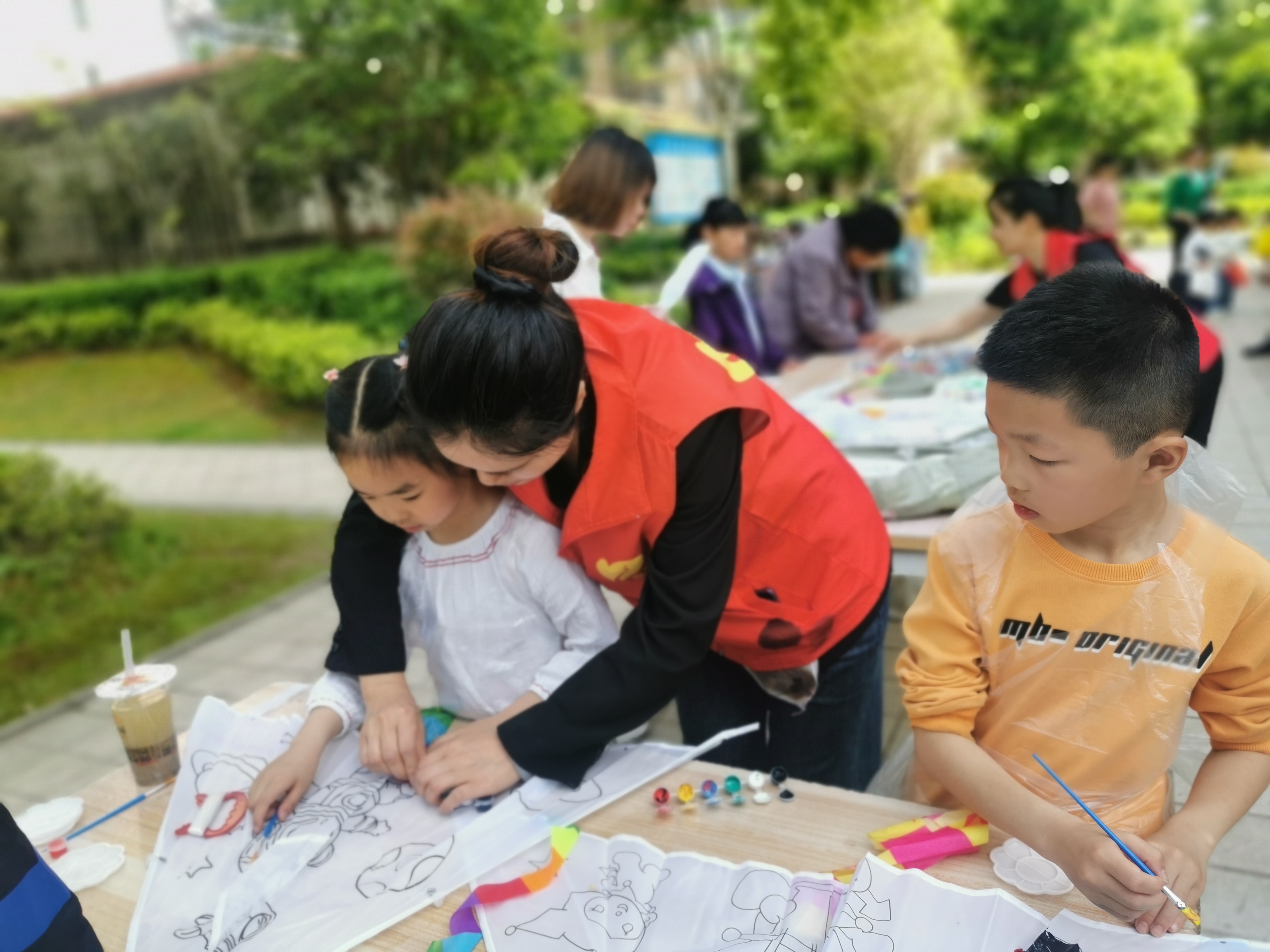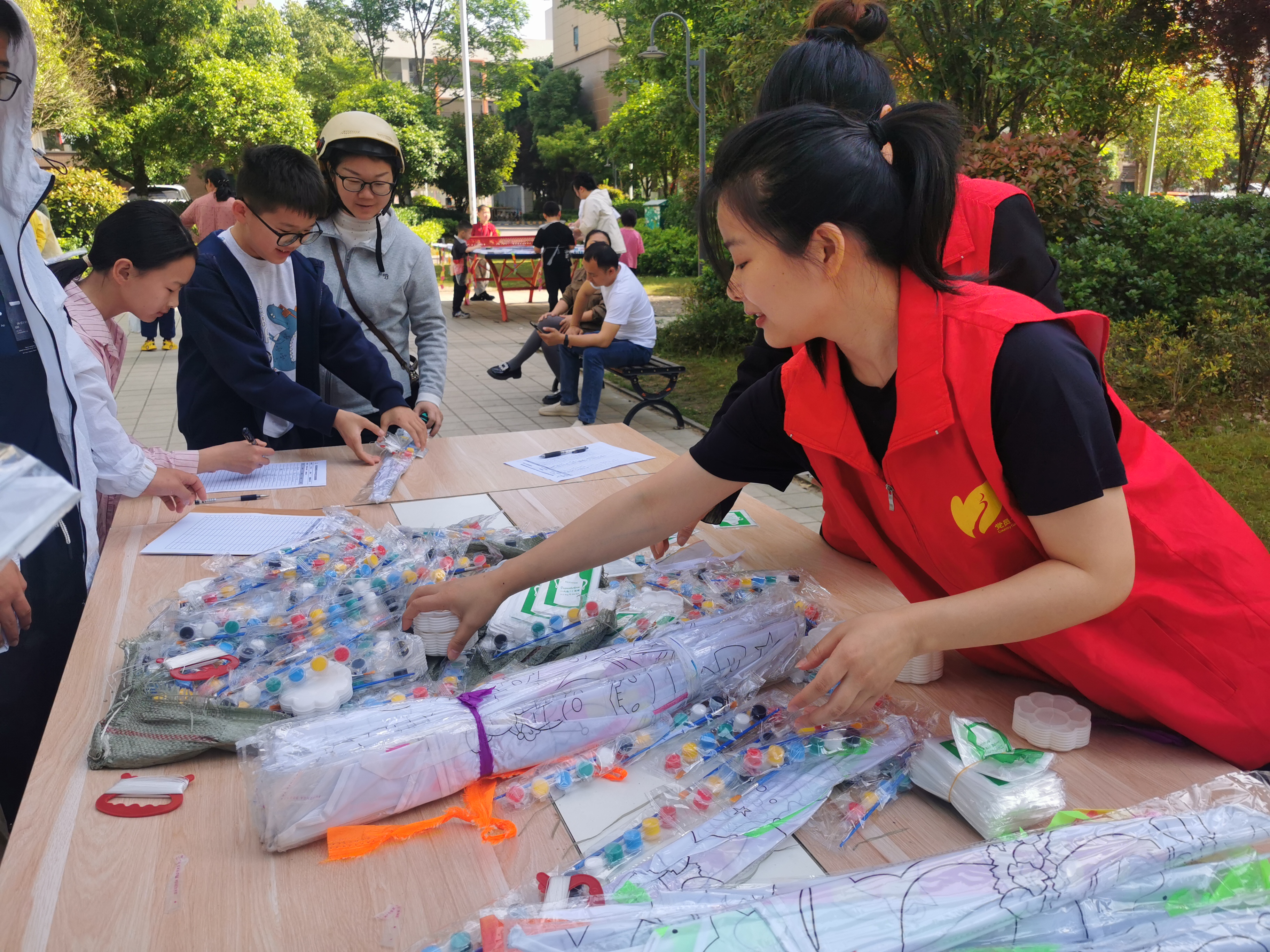 活动伊始,物业工作人员早已提前布置好活动场地,平整的草地上摆放着整齐的桌椅、彩色颜料、画笔、空白风筝以及各类工具,处处洋溢着温馨热闹的氛围。