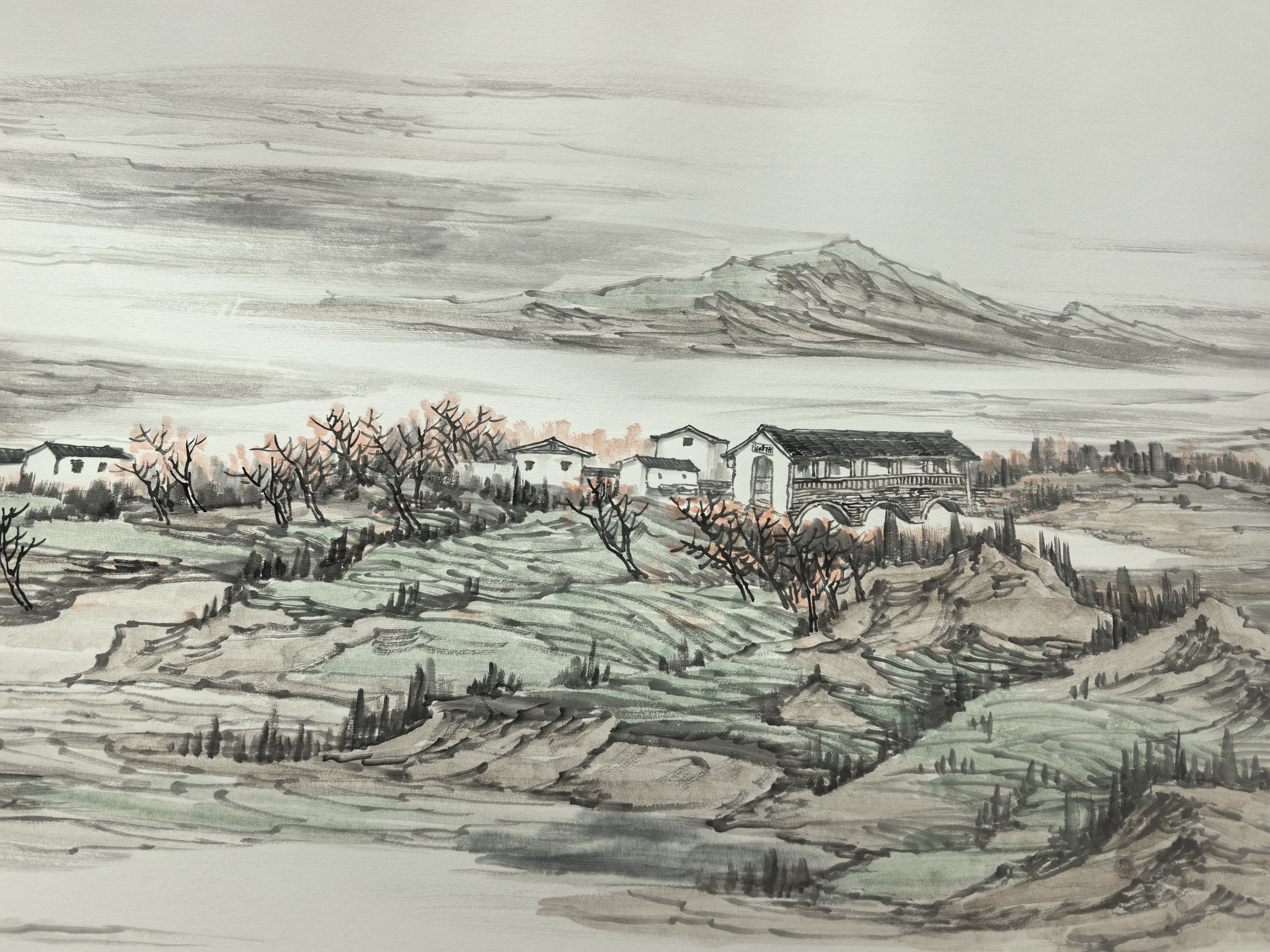 历时一年半打磨技法,他潜心钻研,借鉴董源、巨然等南方画派“披麻皴”技法表现丘陵植被的层次感,同时吸纳西方风景画的光影处理手法增强画面立体度,让传统山水技法在当代创作中完成巧妙转译。最终,75.16公里的淦河风貌被浓缩于百米长卷之中,成就了这部可触摸、可细品的“淦河人文生态纪录片”。