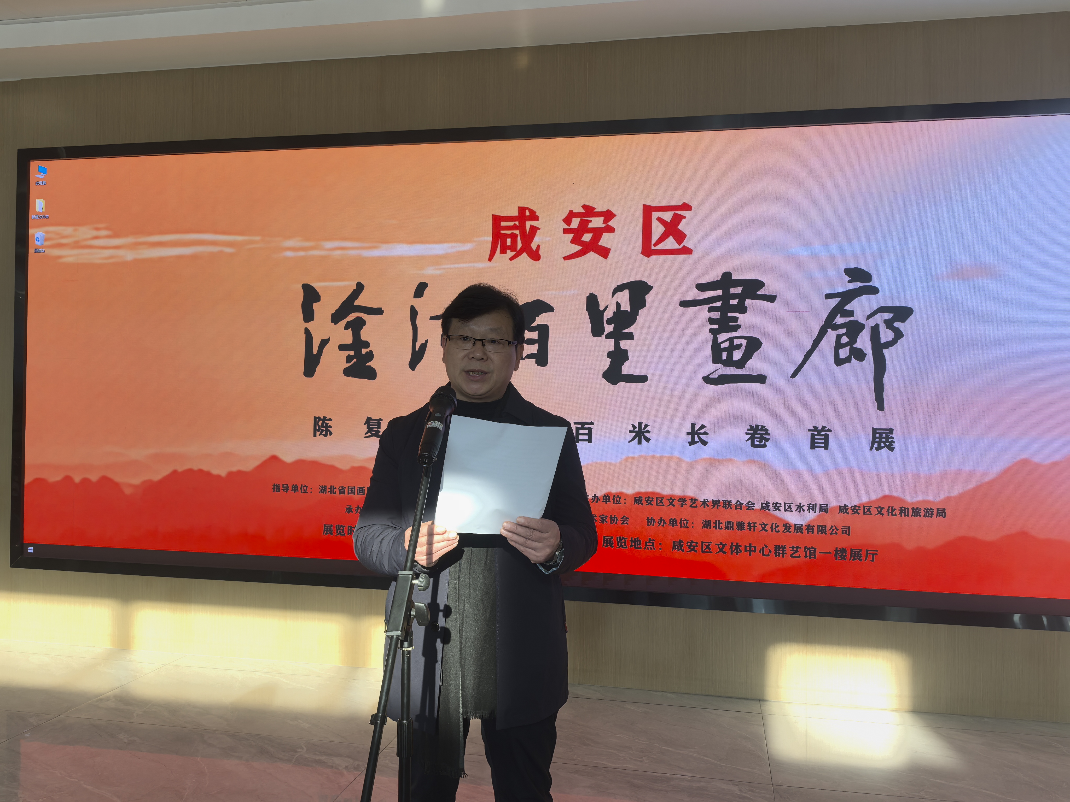 12月29日,咸安区“淦河百里画廊·陈复兴淦河百米长卷画展”在咸安区文体中心文化馆一楼展厅温情启幕。国家一级美术师陈复兴耗时两载匠心打磨的《淦河百里画廊》长卷,将咸宁“母亲河”的灵秀风姿与厚重底蕴尽数铺展于展厅之中,近千名书画爱好者与市民慕名而来,共赴一场笔墨与文脉的深情邂逅。