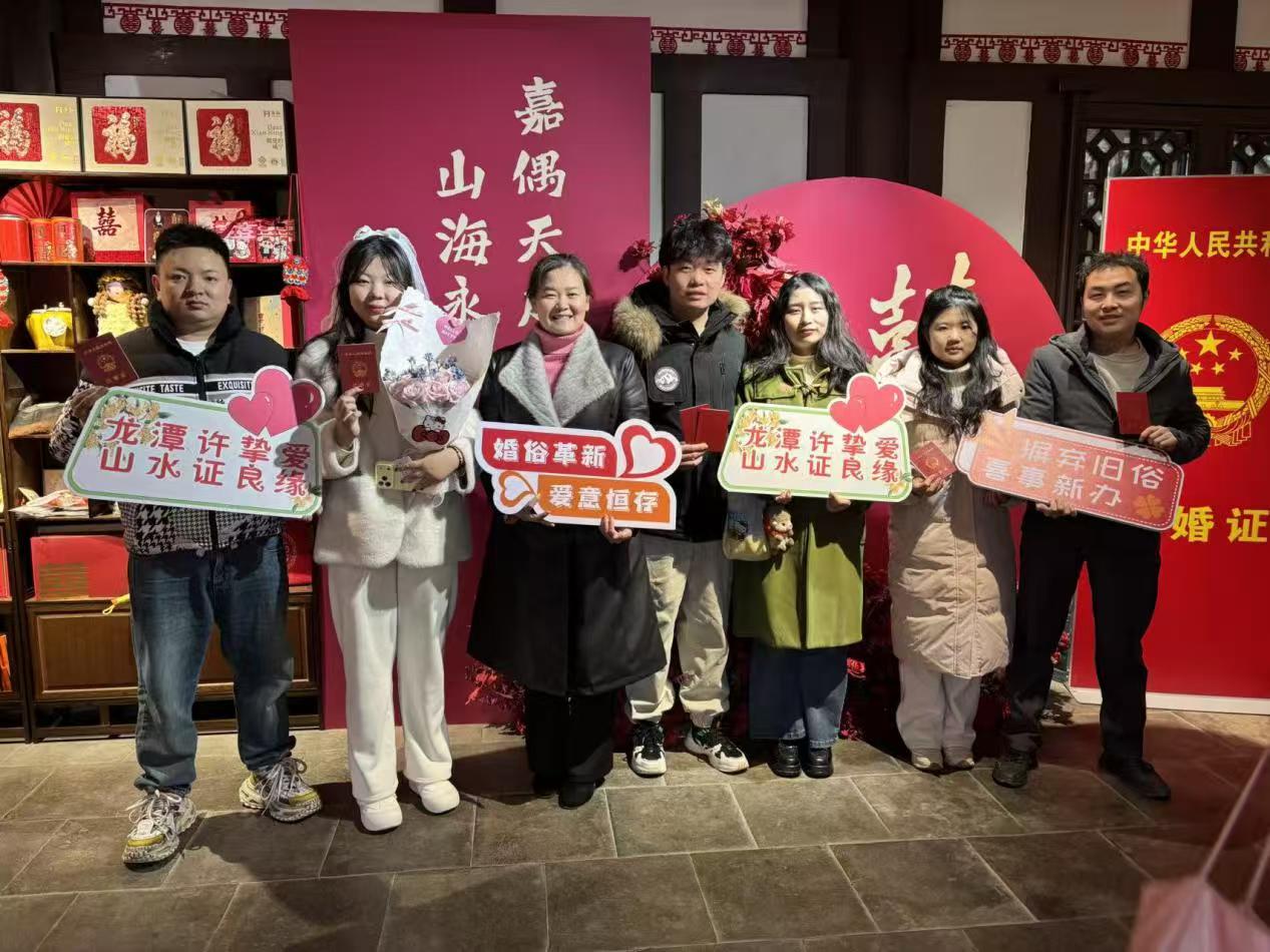 1月1日元旦佳节,细雨如丝浸润着咸安龙潭里景区,而景区内全市首个景区式婚姻登记地标“牵缘阁”内,却暖意融融、爱意涌动。当天,二十对新人专程奔赴这场“山水之约”,在新年第一天领取结婚证,于古色古香的景致中收获“小家圆满”与“新年喜乐”的双重幸福,携手开启人生崭新篇章。