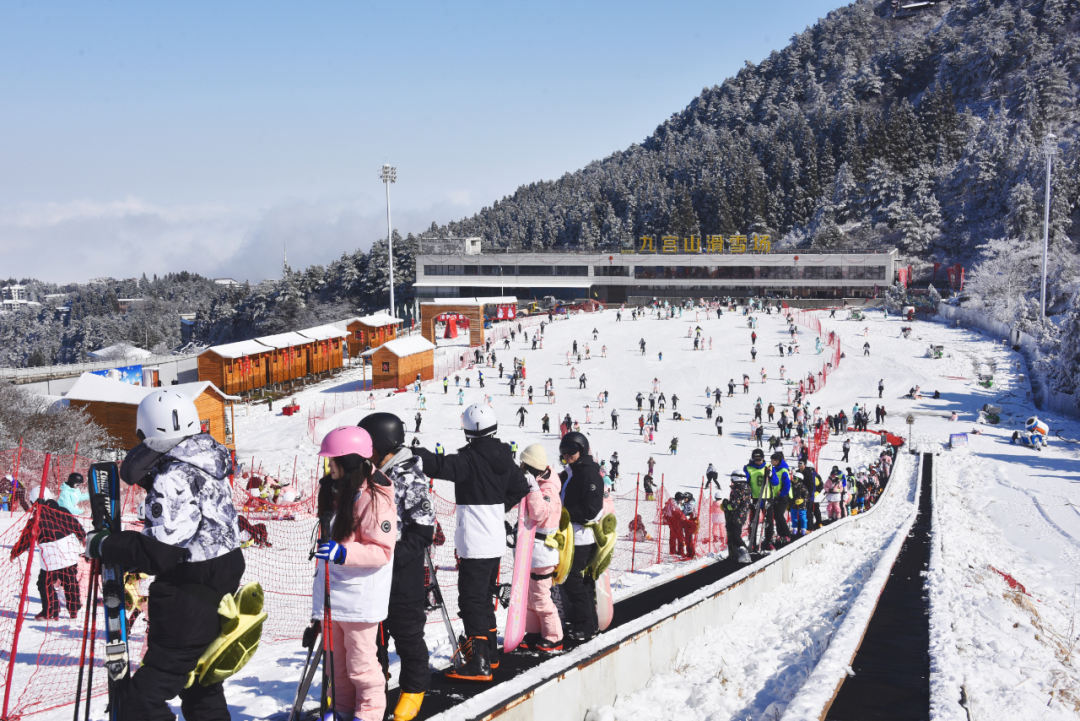 九宫山滑雪场的雪道上满是飞驰的身影,元旦首日的滑雪场人气旺到不行。