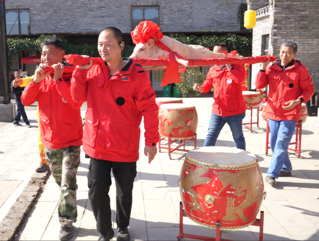 正午的年猪宴开席,龙骨萝卜汤、香猪肉片等特色菜品香气扑鼻,搭配民俗锣鼓、《采莲船》表演,食客们大快朵颐。
