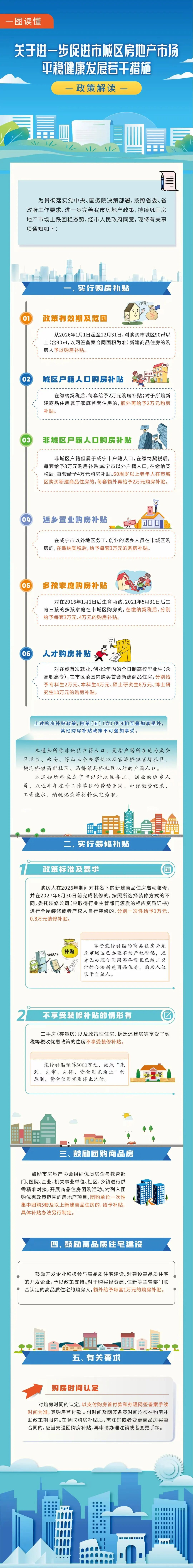 1月9日,市住新局、市财政局、市人社局、市资建局、市卫健委、市商务局六部门联合印发《关于进一步促进市城区房地产市场平稳健康发展若干措施》,其中明确市城区实施新一轮购房补贴政策,并新增装修补贴、鼓励团购商品房等举措,旨在进一步巩固房地产市场止跌回稳态势,支持居民合理住房需求。