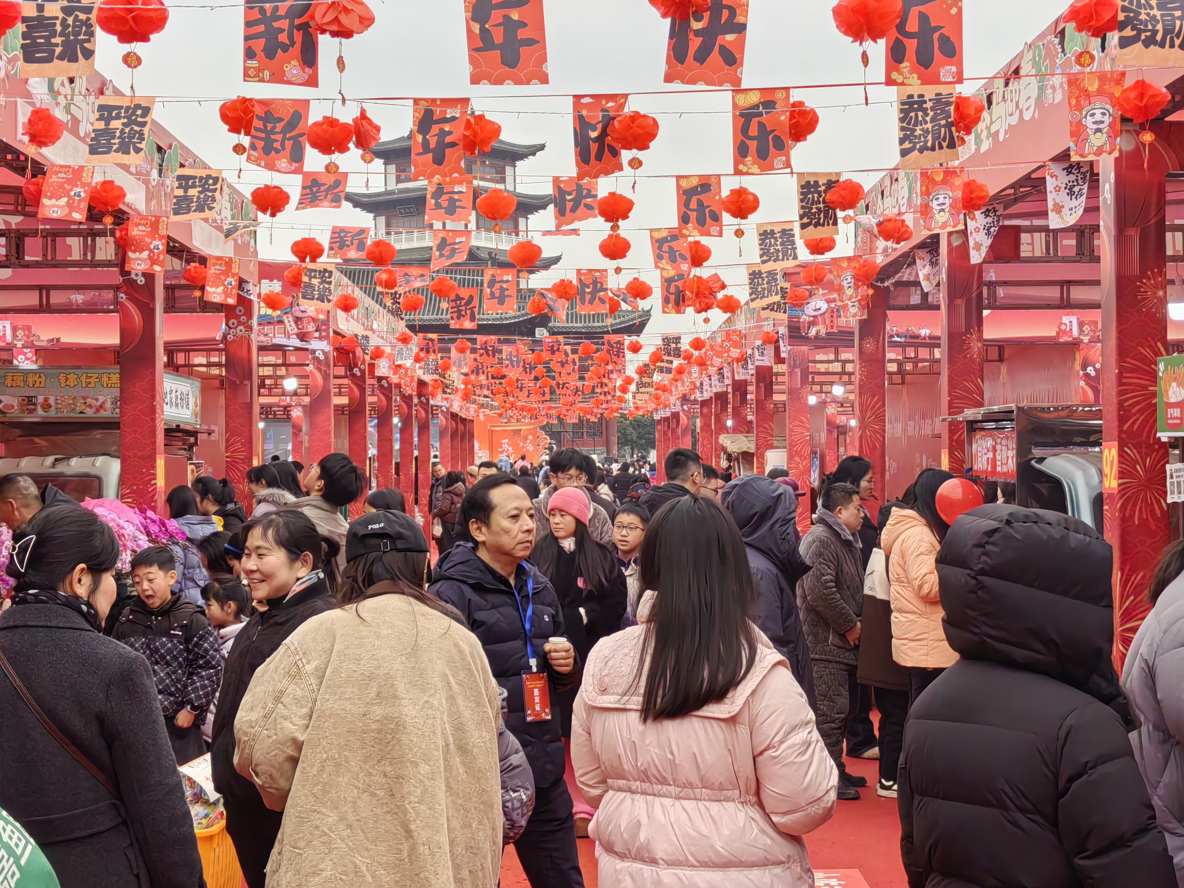 台上好戏连台,台下的集市里同样热闹非凡。农特产品、家具家电、水果……集市里,各种年货琳琅满目,令人目不暇接;主播现场带货吆喝声不断,烟火气十足。