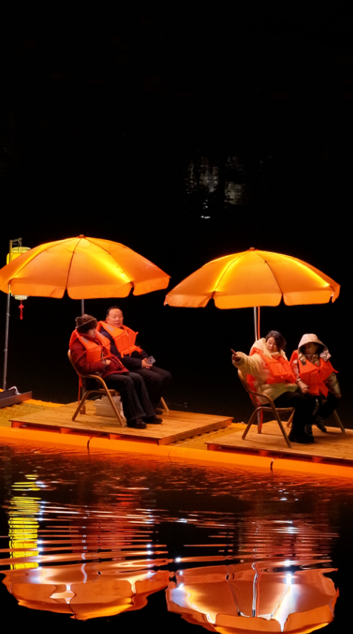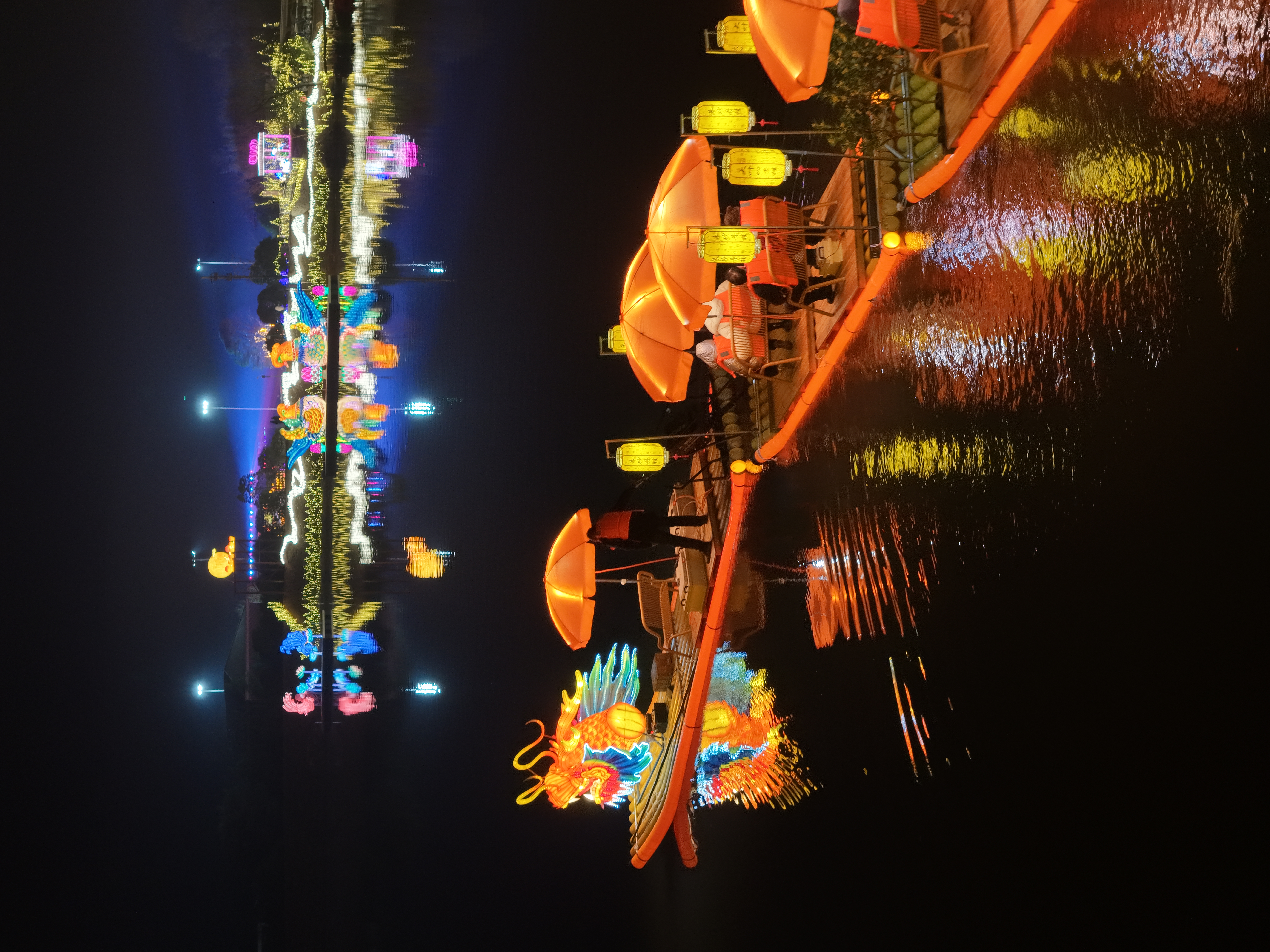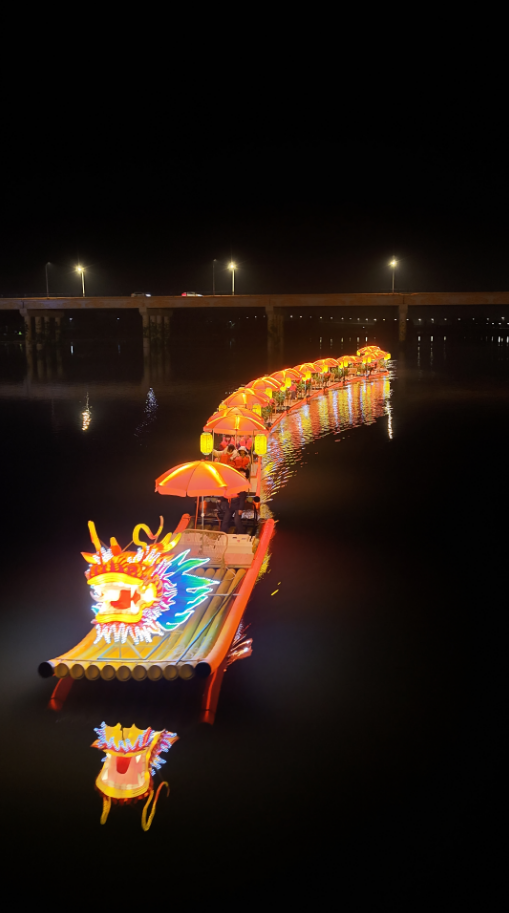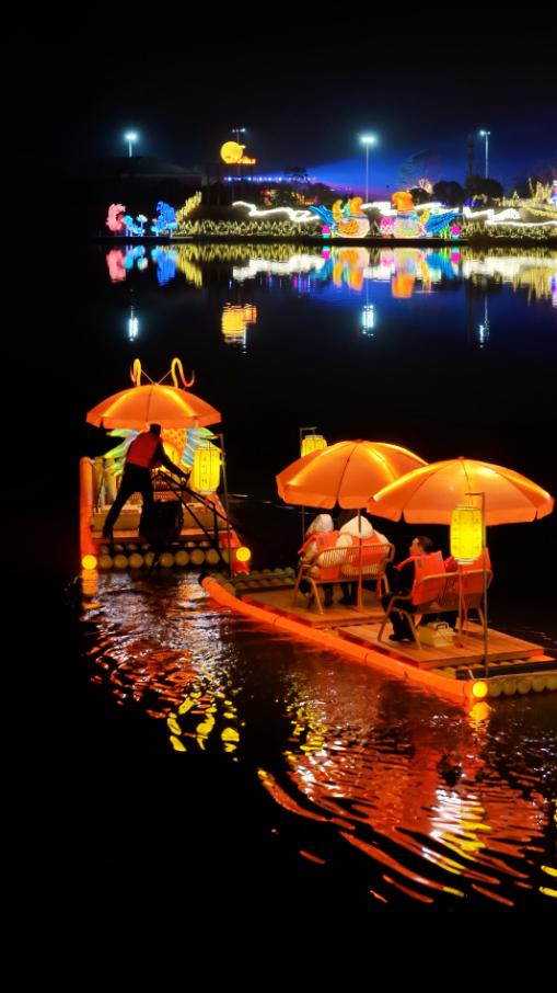 湖面全息投影光影秀如梦似幻。七彩拱门下,激光穿梭流转,时而化作遨游深海的巨鲸,时而幻化为奔腾千里的骏马,葫芦兄弟等经典动画形象跃然水上,唤醒无数人的童年记忆。26米长的水上龙灯蜿蜒游弋,与百米竹筏游龙相映成趣,水波倒影,如诗如画。