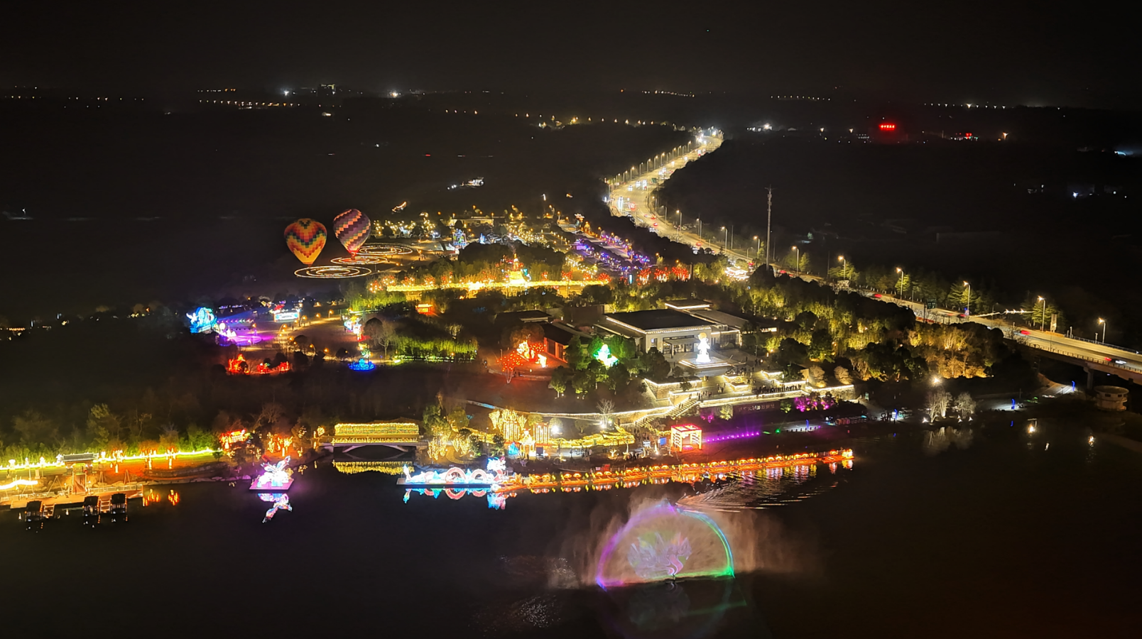 除了水上与舞台的视听盛宴,草地中央同样氛围感拉满。三座巨型热气球灯饰通体透亮,游客可登临其上,俯瞰整片灯海,将万千灯火尽收眼底。