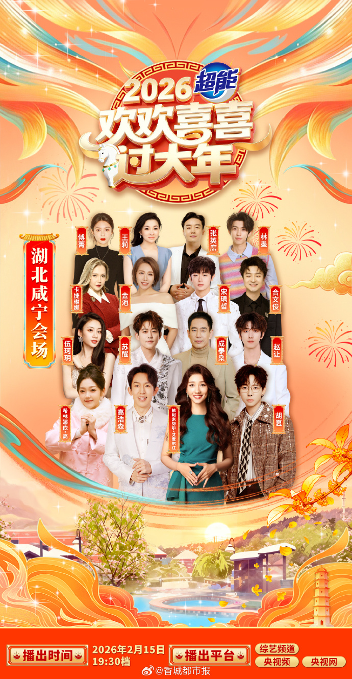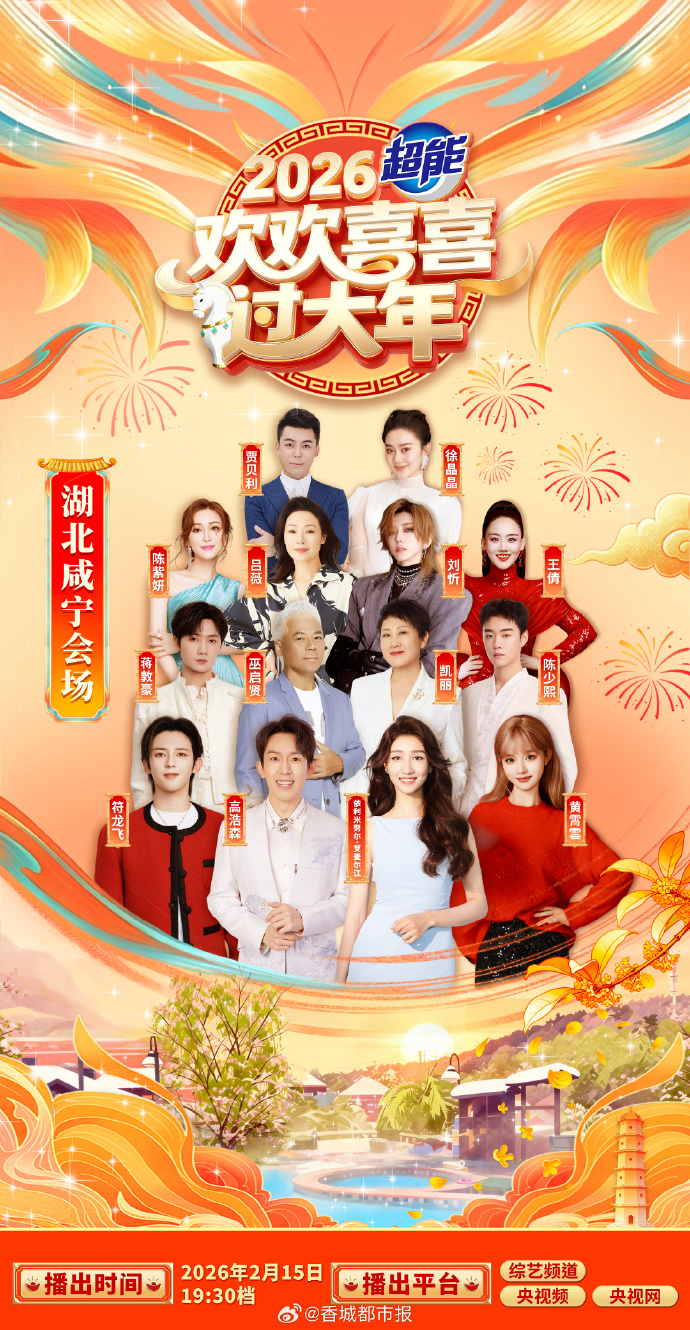 2月14日,记者从中央广播电视总台2026年春节特别节目《欢欢喜喜过大年》咸宁场活动组委会办公室了解到,节目将于2月15日(腊月二十八)19:30,在中央电视台综艺频道(CCTV-3)正式播出,节目时长45分钟,节目视频也将在央视频APP、央视网等平台同步推出。