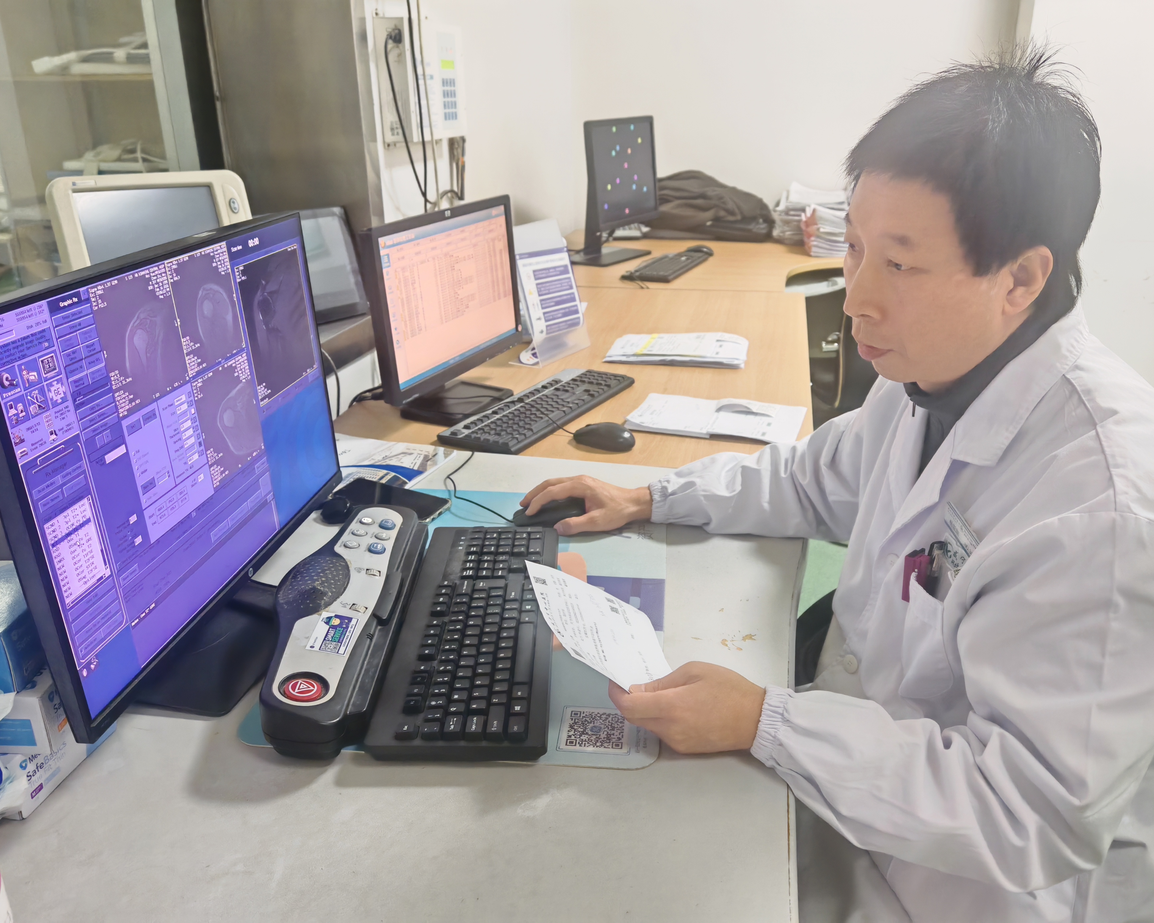 这名患者因肩关节痛来就医,杨亚刚了解情况后,严格按照标准摆正患者检查部位,叮嘱好注意事项后便来到电脑前仔细操作,很快便顺利做好了检查,为医生后续诊治提供坚实依据。