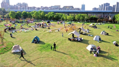 4月4日,清明小长假首日,在市区玉泉街东侧开放共享的游园绿地,人们搭起帐篷、铺上野餐垫,享受盎然春色。