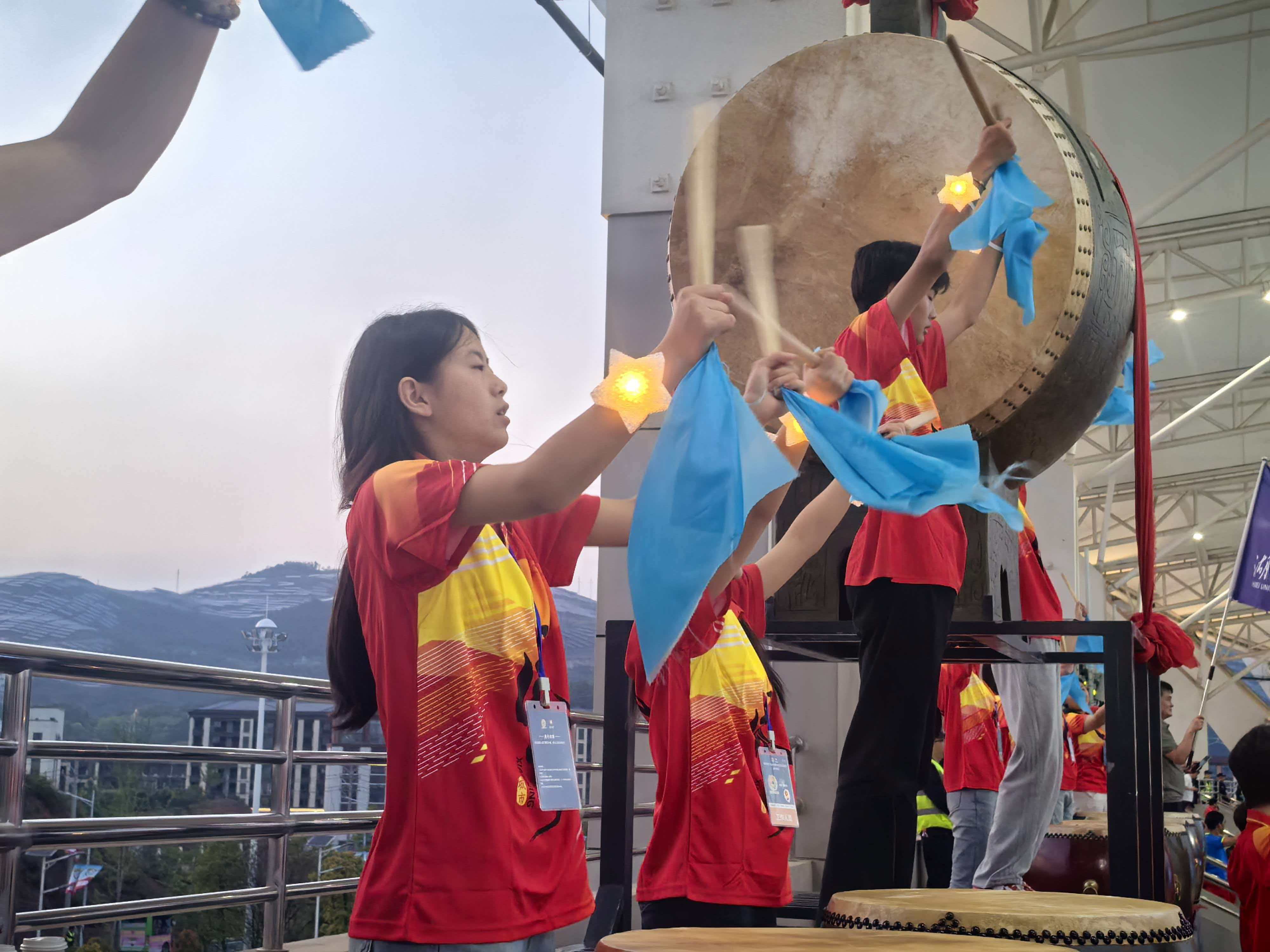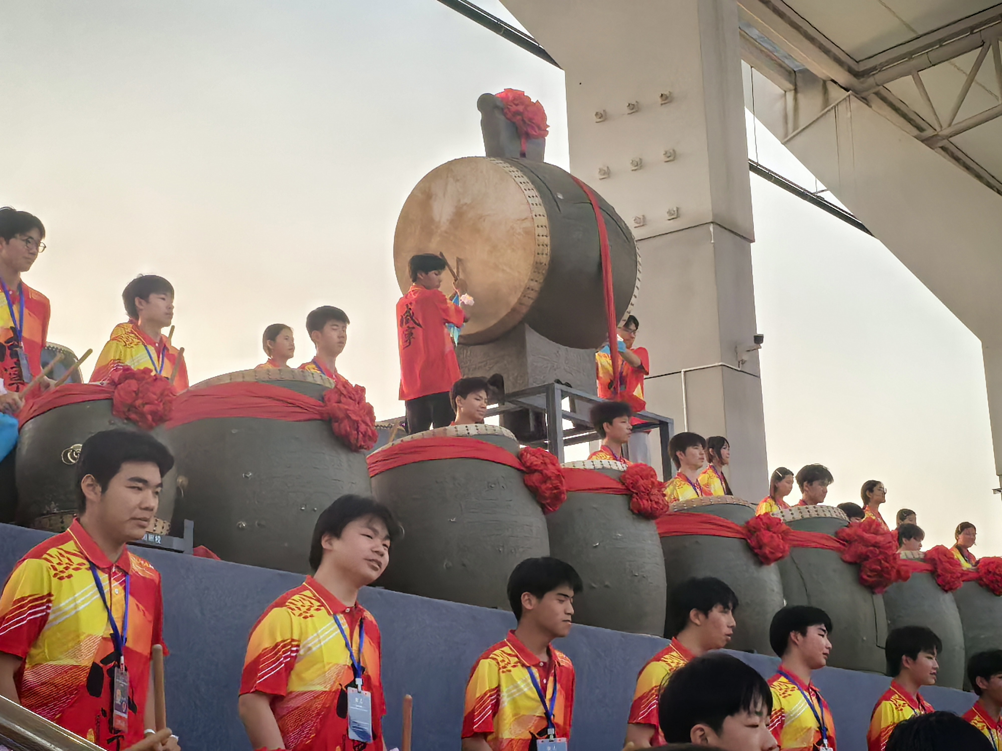 今日,100面铜鼓、108名少年、1.2万人的呐喊,擂成了同一个声音——