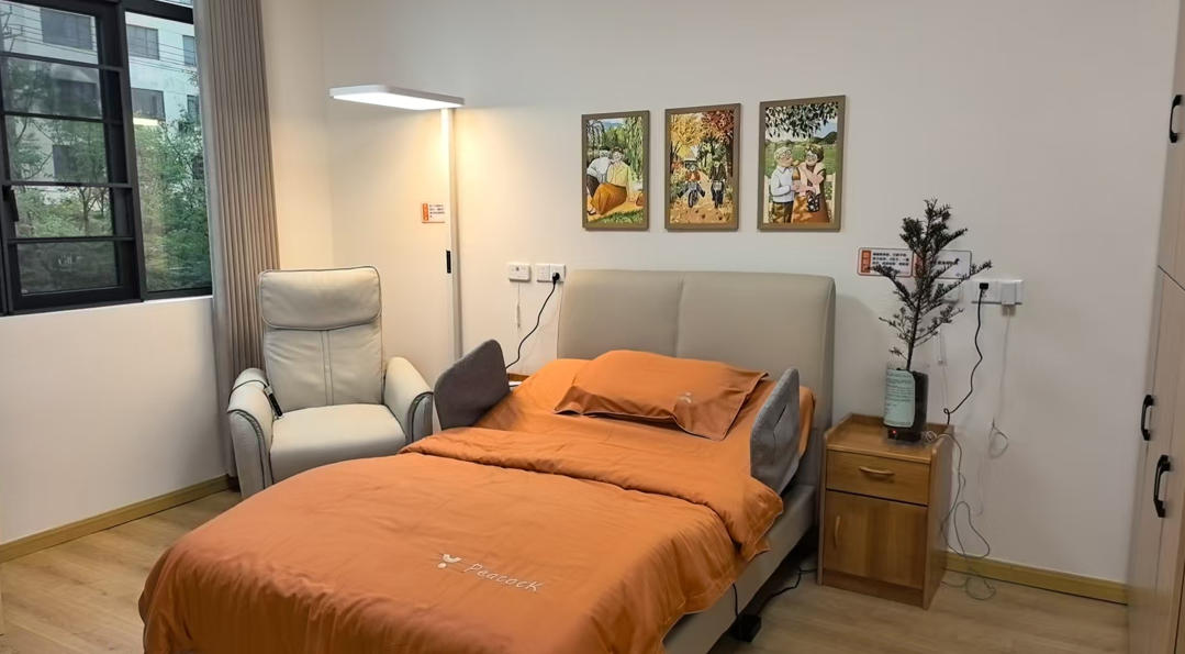 来这里的老人,可以选择“走读”或“住读”,即日间照料或全托照护。“走读生”可以享受会员积分制的所有免费服务,也可参与12元配中餐等付费服务,兼顾普惠性与多样性。“住读生”多为失能、半失能老人,可以获得专业医养结合的照护,还可选择带有心率监测、体位调节功能的智能护理床等。