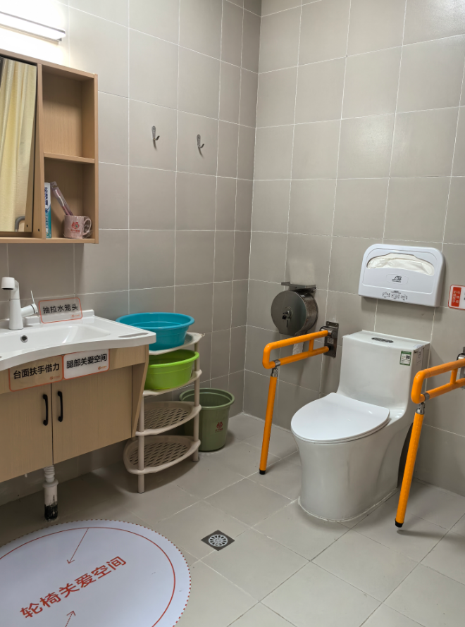 这里分为上下两层,一楼为社区卫生服务站和过道区,连通公租房小区;二楼有康养区、日间照料室、餐厅、理疗室、助浴厅等,整个面积有1800平方米,空间通透敞亮,装修以暖橘为主色调,随处可见适老化细节:圆弧收边的家具、预留足够回转空间的卫浴区域、专为老人配置的地灯与老花镜……