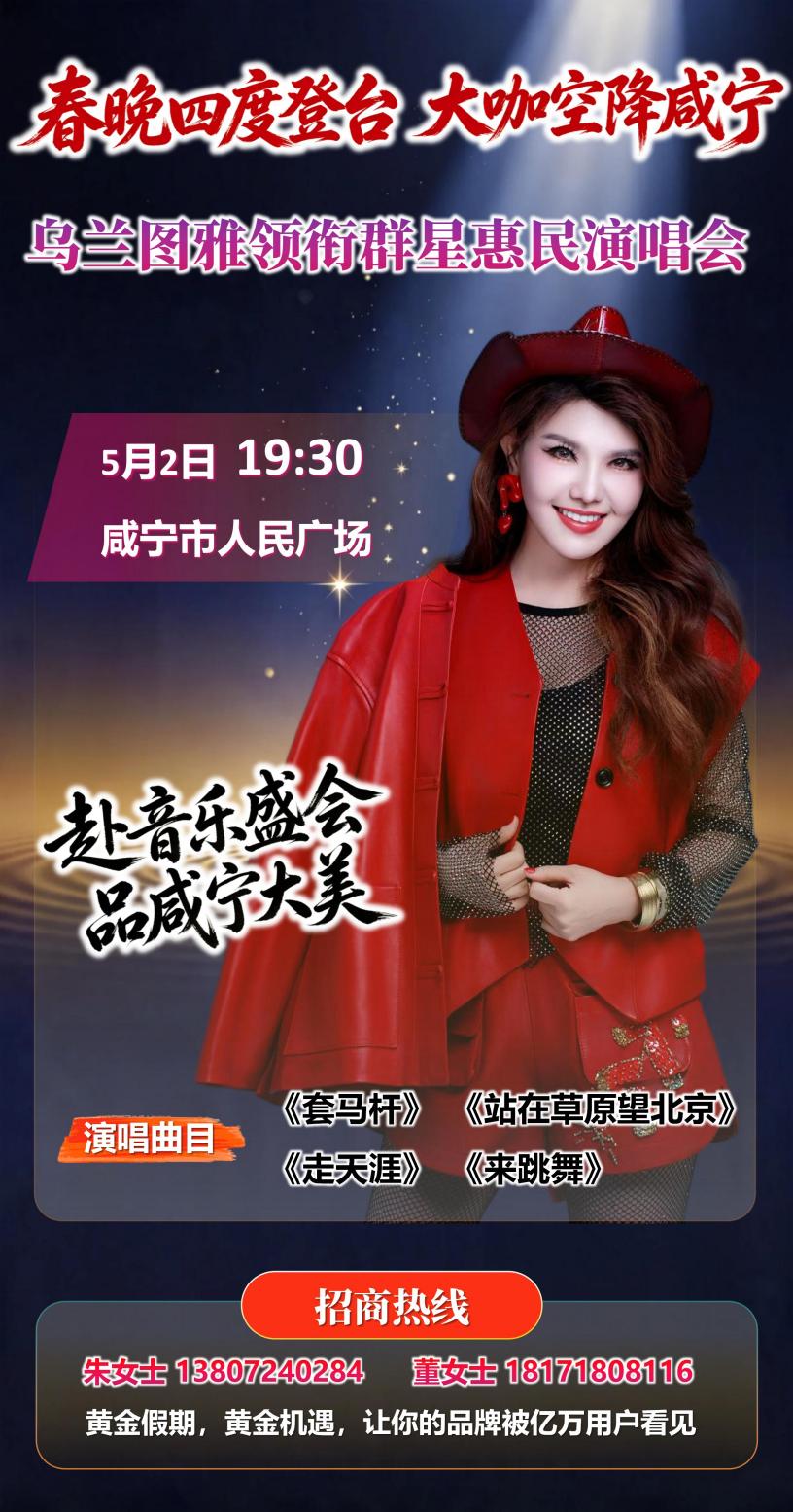 备受瞩目的“泡完温泉听场歌”2026咸宁市五一群星惠民演唱会将于5月2日在咸宁市人民广场温情启幕,一场集视听盛宴与惠民初心于一体的文化狂欢即将来袭。其中,最令人期待的亮点是——四度登上央视春晚的蒙古族实力唱将乌兰图雅将重磅空降演唱会现场,用高亢嘹亮的草原嗓音,为咸宁市民及游客献上一场穿越草原与香城的音乐邂逅。