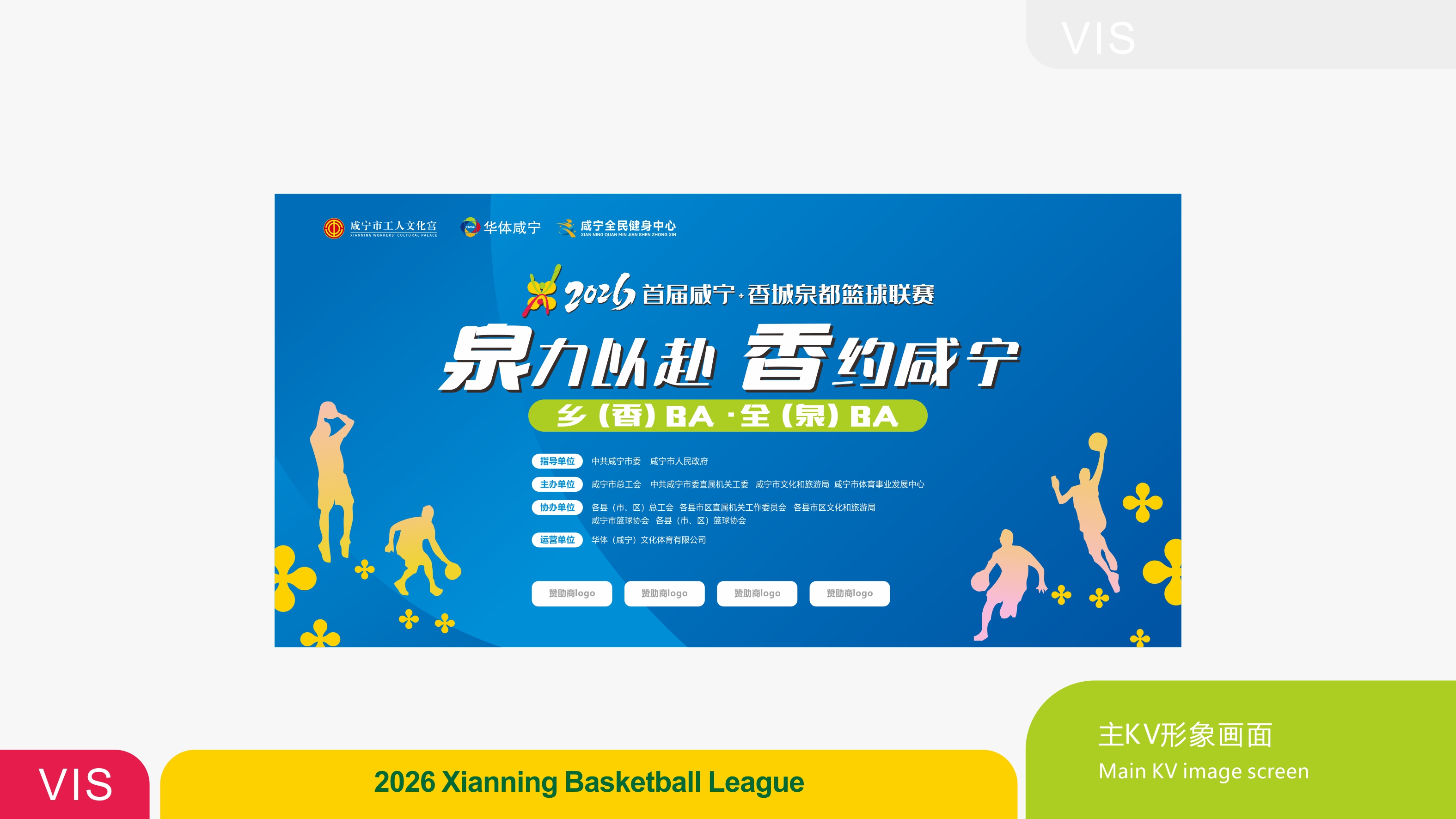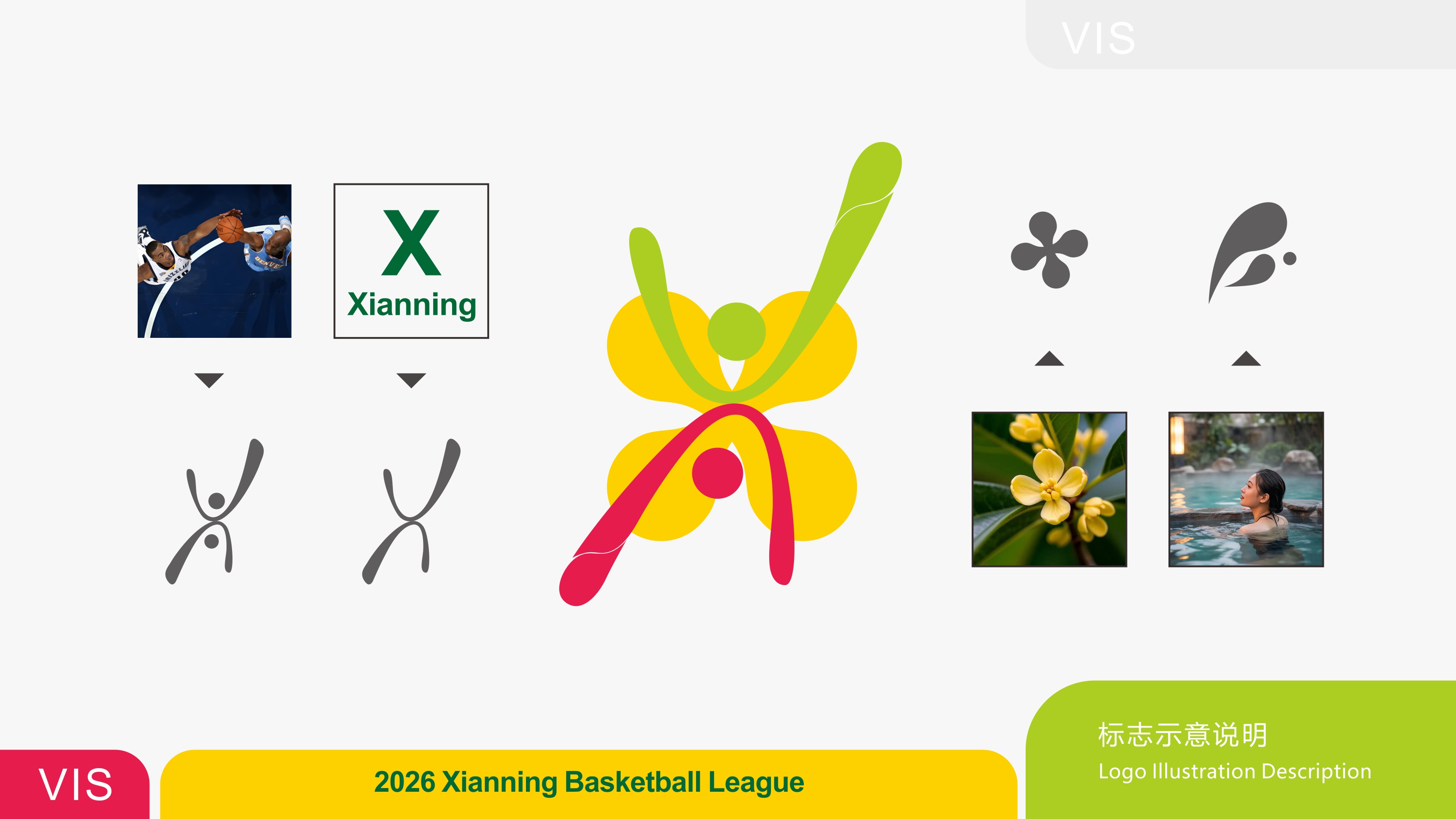 赛事LOGO设计中巧妙融入城市符号。以两名球员跃起争球的动态造型为主体,肢体线条自然构成字母“X”,代表咸宁拼音首字母;融入水滴元素,呼应咸宁“泉都”的城市名片;以市花桂花为背景衬托,彰显地域文化。LOGO设计整体诠释了“泉力以赴 香约咸宁”的赛事理念。