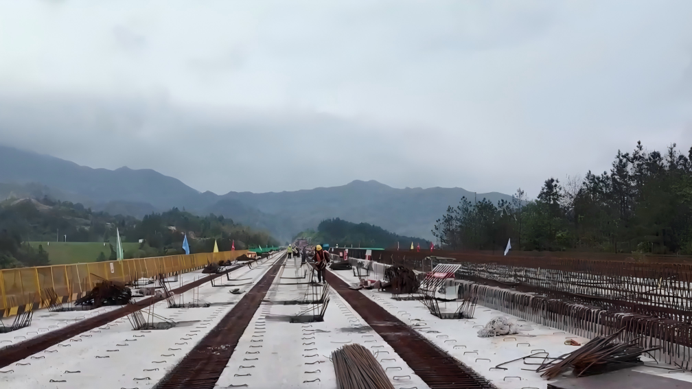 通修高速三标段生产经理汤洋介绍,文家屋大桥、坳上大桥左幅已全线贯通,桥面架设全部完成,目前正推进文家屋大桥右幅桥面施工。这两座大桥横跨深山坳谷,1124米路线高差起伏极大,桥梁墩柱最高达39.6米、最低仅2米,悬殊的高程差对施工精度提出严苛要求,是标段内的重点控制性工程。