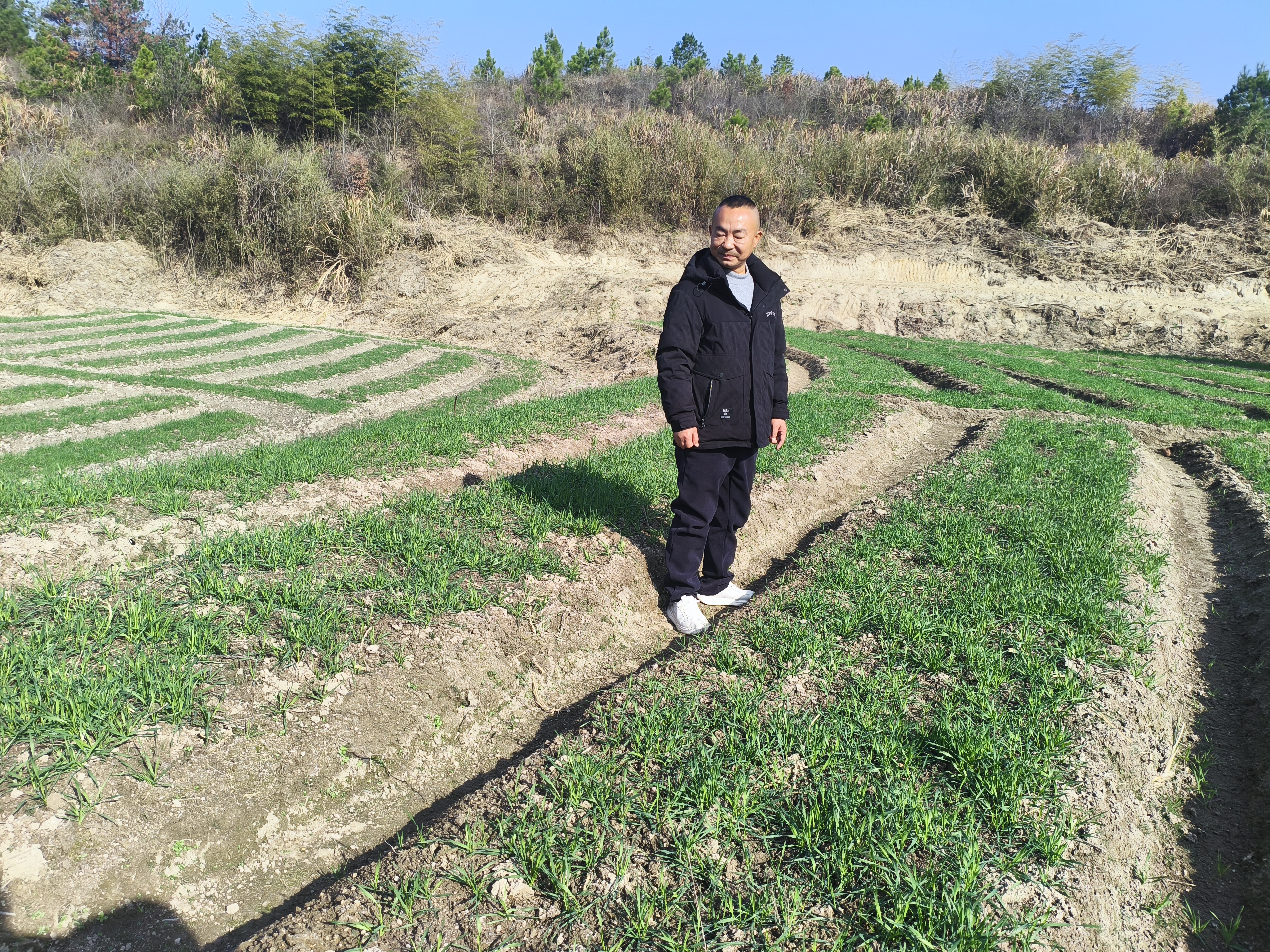 1月6日,崇阳县肖岭乡三角村7组屋后,梯田如画,麦浪连天。