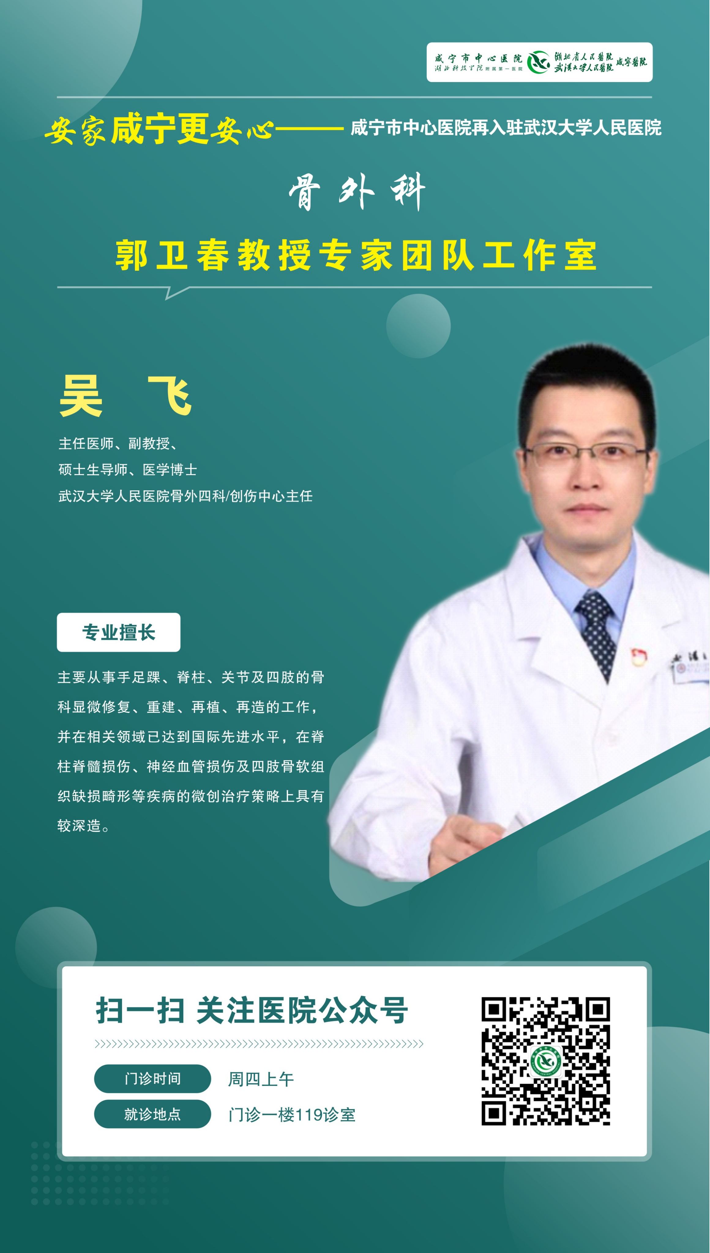 手足外科 | 周四上午 | 吴飞 主任医师 | 门诊一楼 119诊室 |
