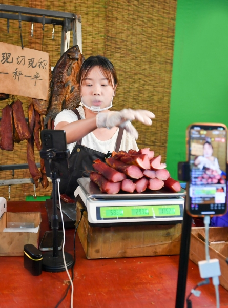 日前,湖北杨腊味食品有限公司车间内,主播在线上直播销售熏制的腊味食品。