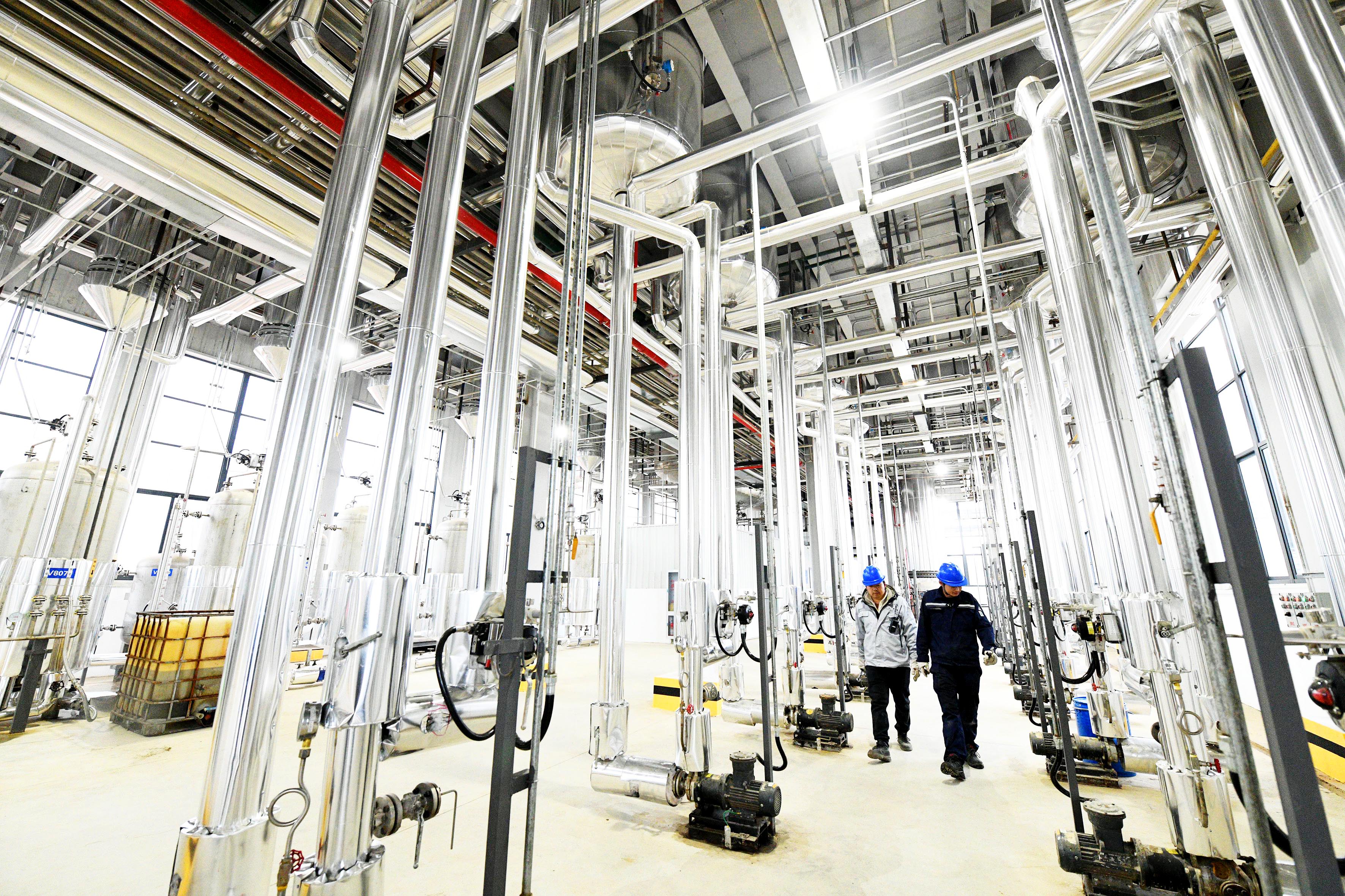 12月23日,赤壁高新区,叁生万物(赤壁)生物工程有限公司正相工业色谱生产车间,设备维护工程师在巡视设备运行情况。