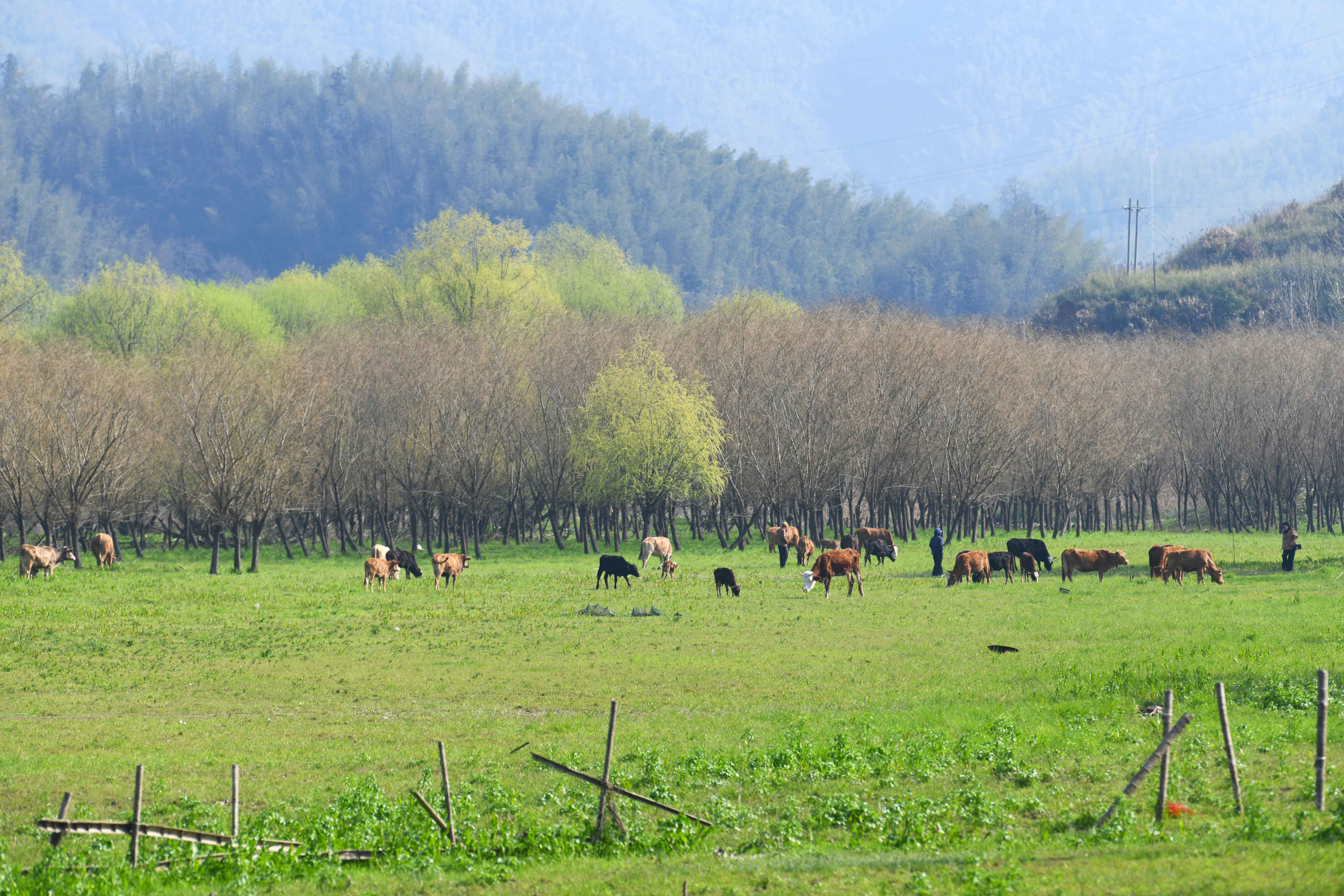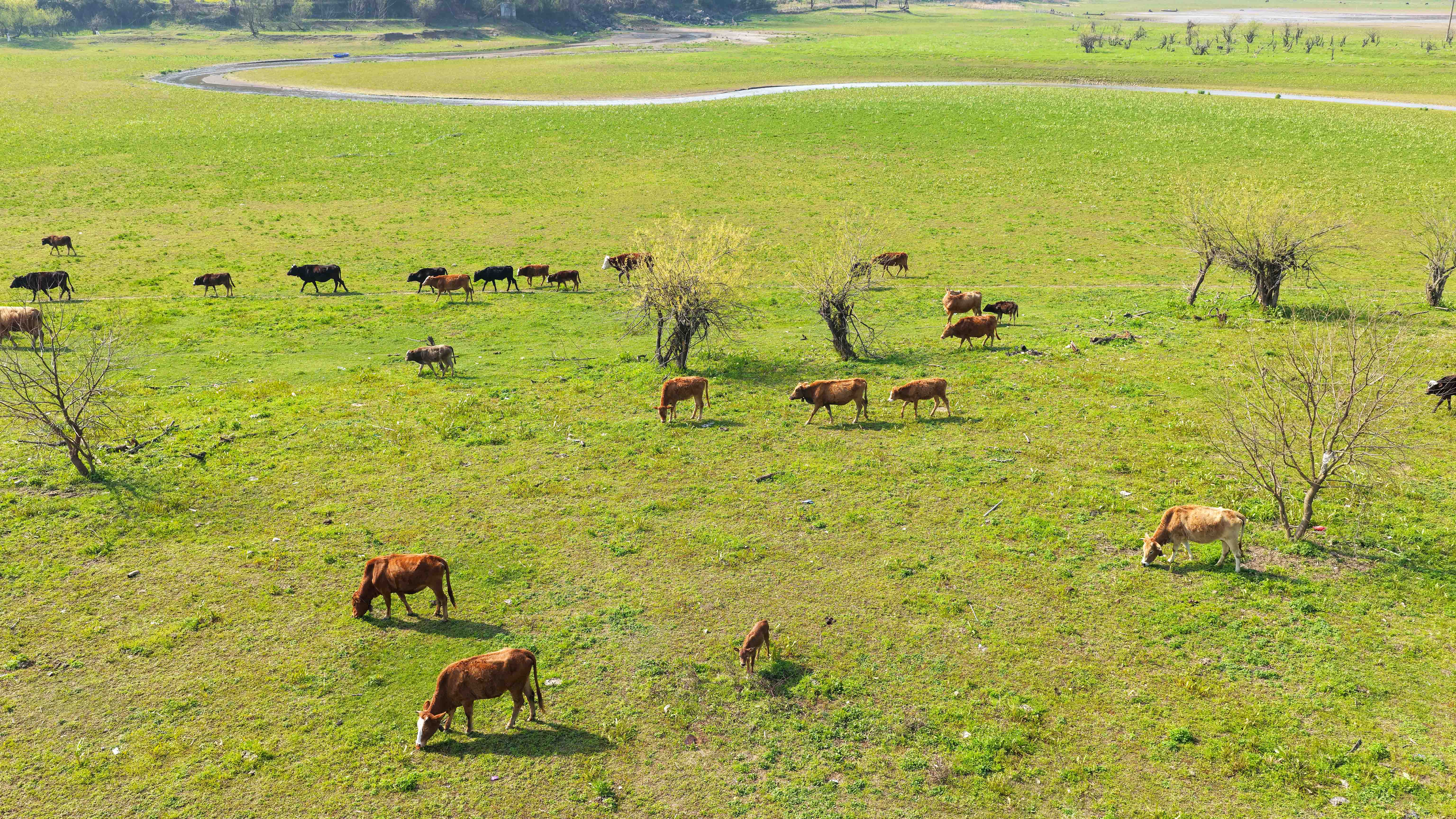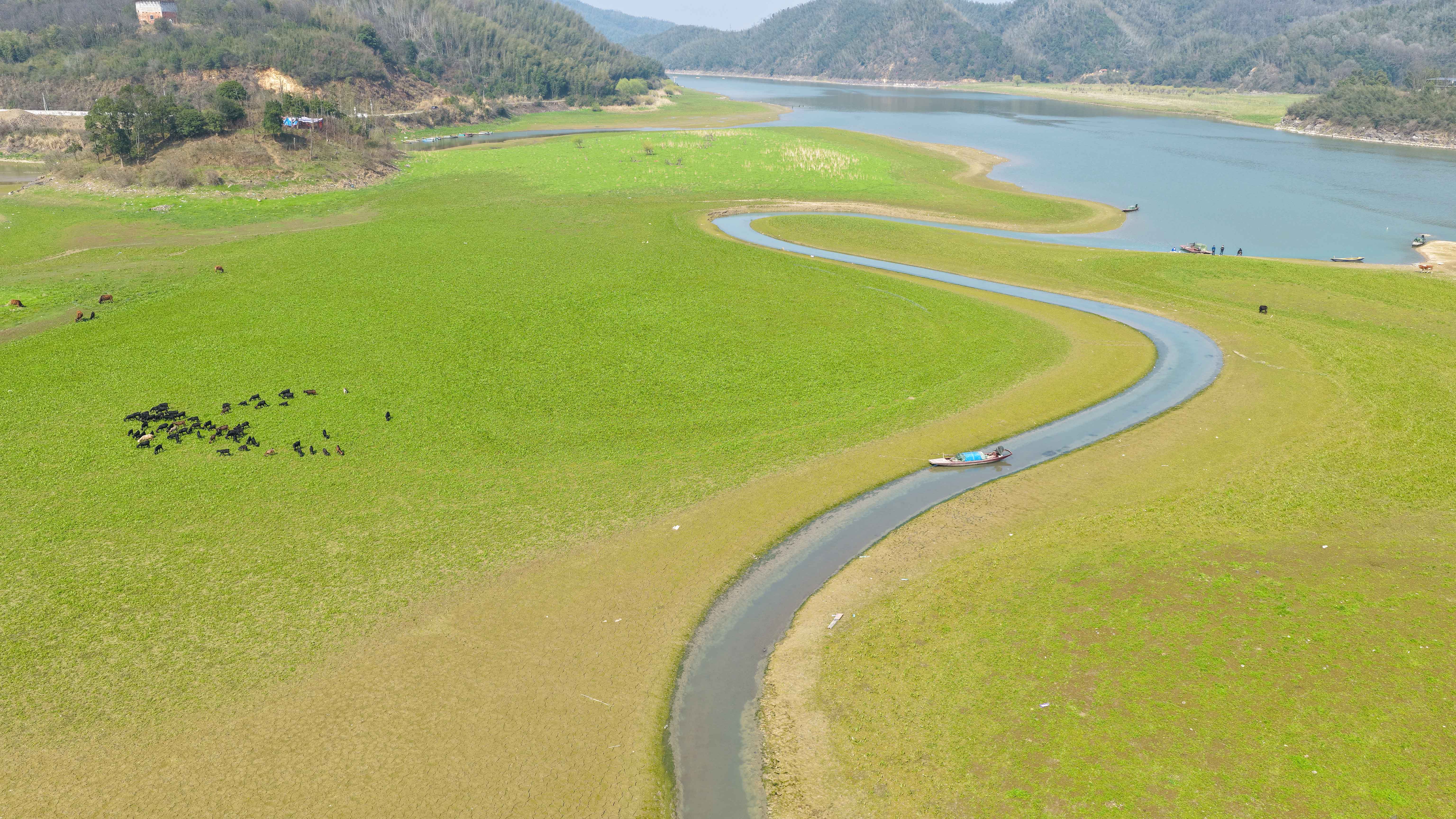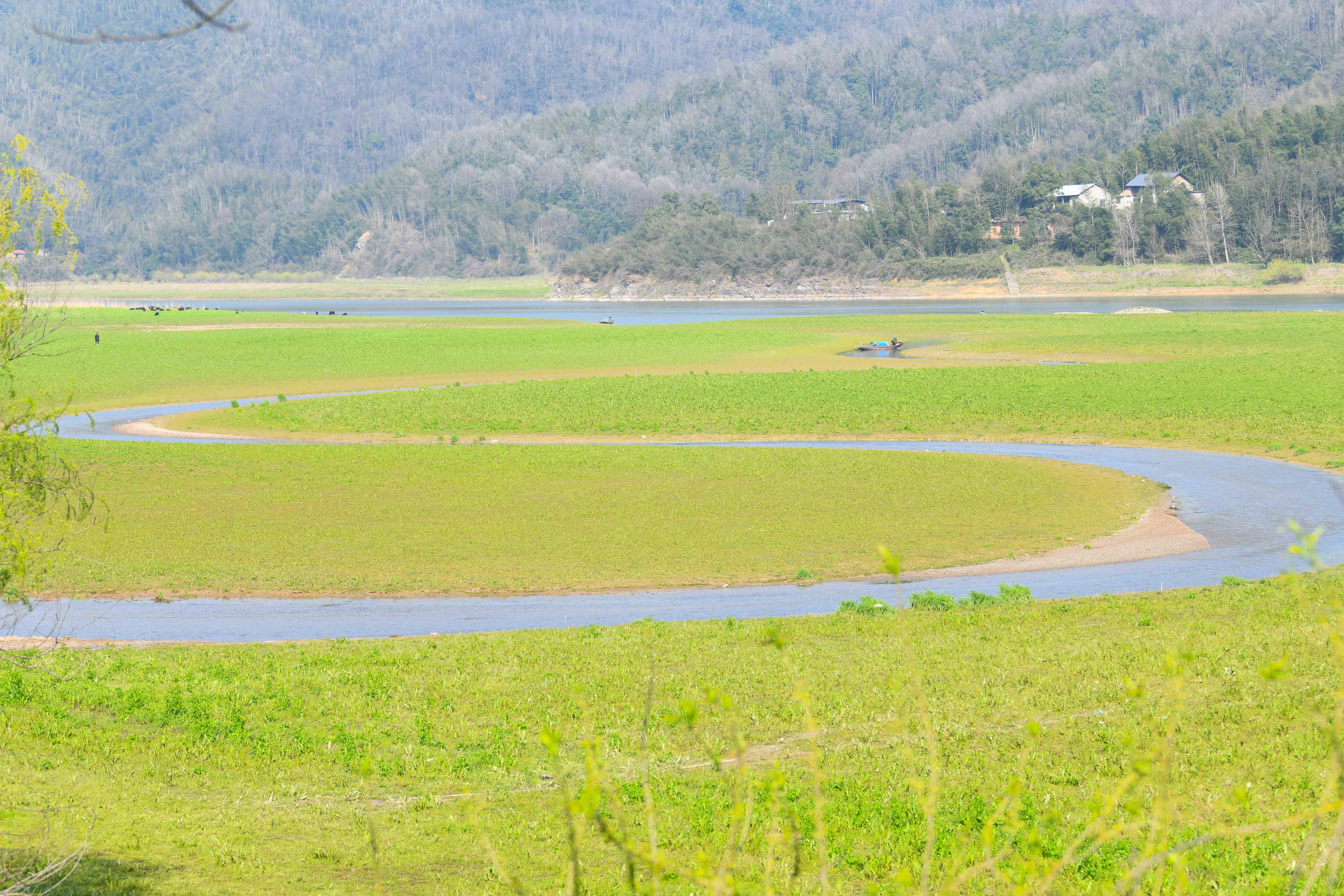 3月10日,早春时节,崇阳县天城镇洪下村境内的十里画廊好似一幅鲜活灵动的山水春景图,杨柳抽芽吐绿,水草丰茂鲜亮,蜿蜒的河道如柔丝穿梭在茵茵草甸间,一叶小舟静泊水畔,与草甸勾勒出柔美的曲线。远处层叠青山晕染出深邃底色,草甸上牛群悠然觅食,为静谧景致添了几分烟火气。