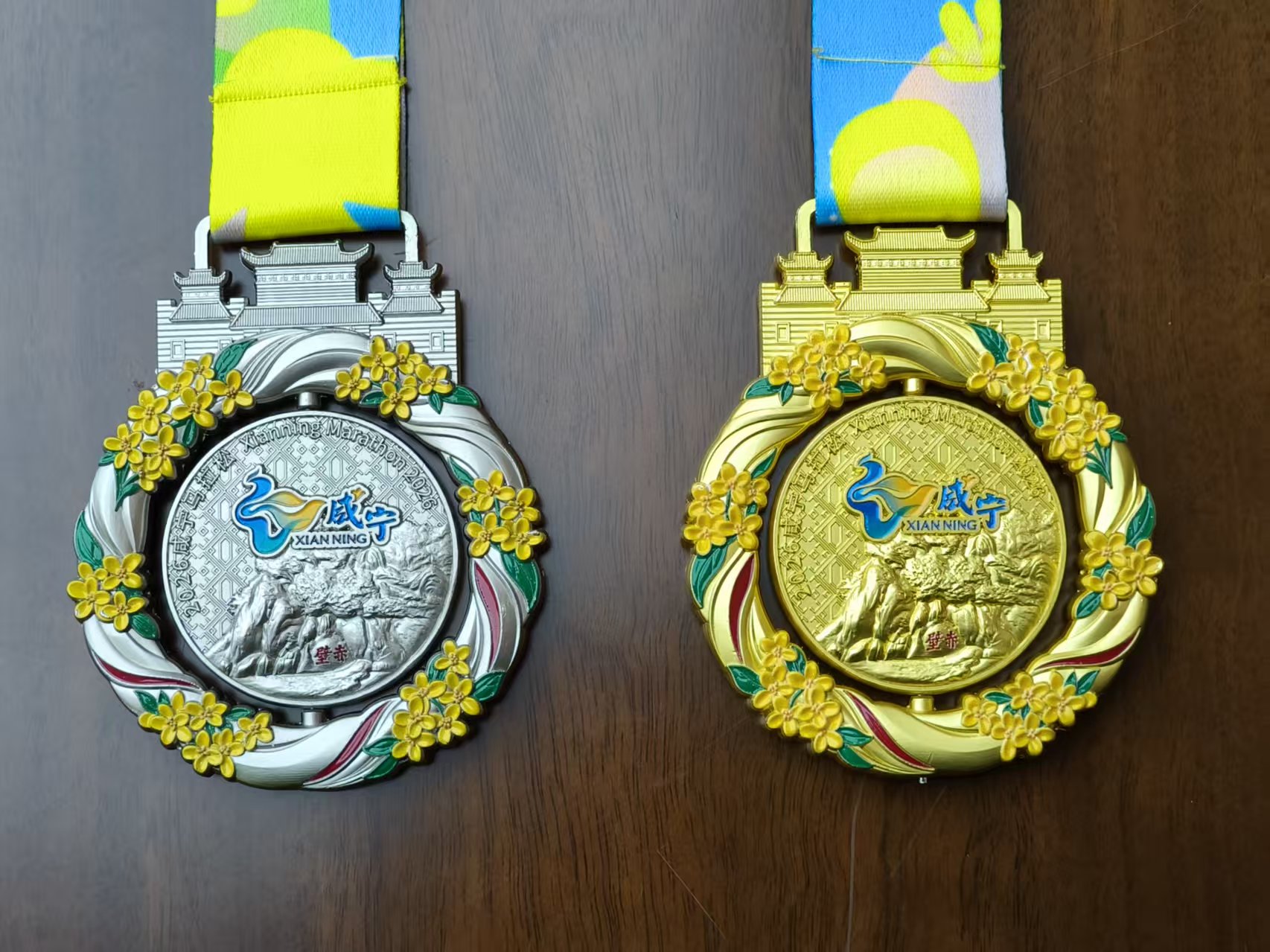 繁花环绕之中,奖牌采用精湛的浮雕工艺,将北伐汀泗桥战役遗址纪念馆的巍峨轮廓、赤壁山体的雄浑意象、摇曳的楠竹风骨以及古朴神秘的古瑶文化图案浓缩于方寸之间,勾勒出一幅“英雄豪情、山水相依、文脉绵长”的立体城市画卷,凝练地诠释了咸宁作为历史名城与生态之城的独特气质。