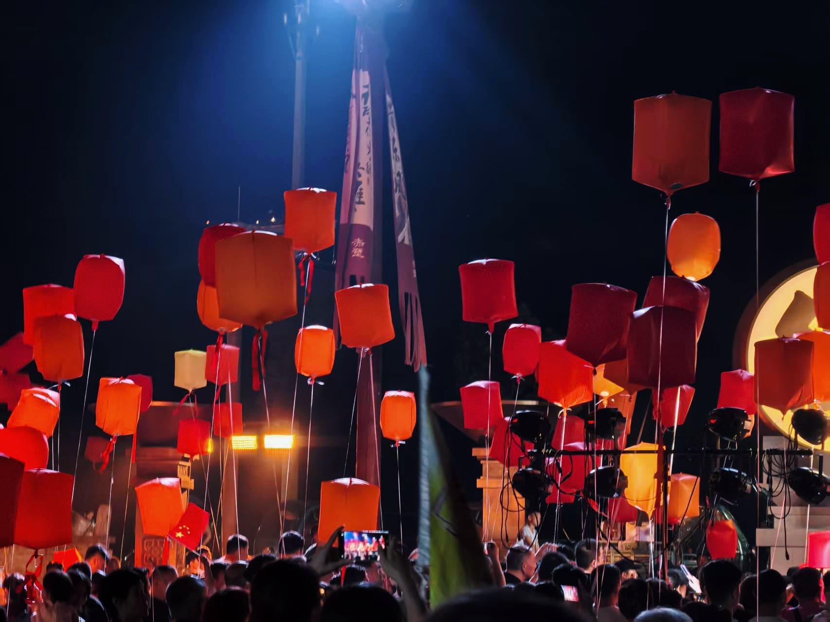 10月6日,中秋之夜,赤壁古战场东风街上空升起万千盏孔明灯。上千名来自全国各地的游客在此共溯三国风云,以千年民俗寄托团圆祈愿。