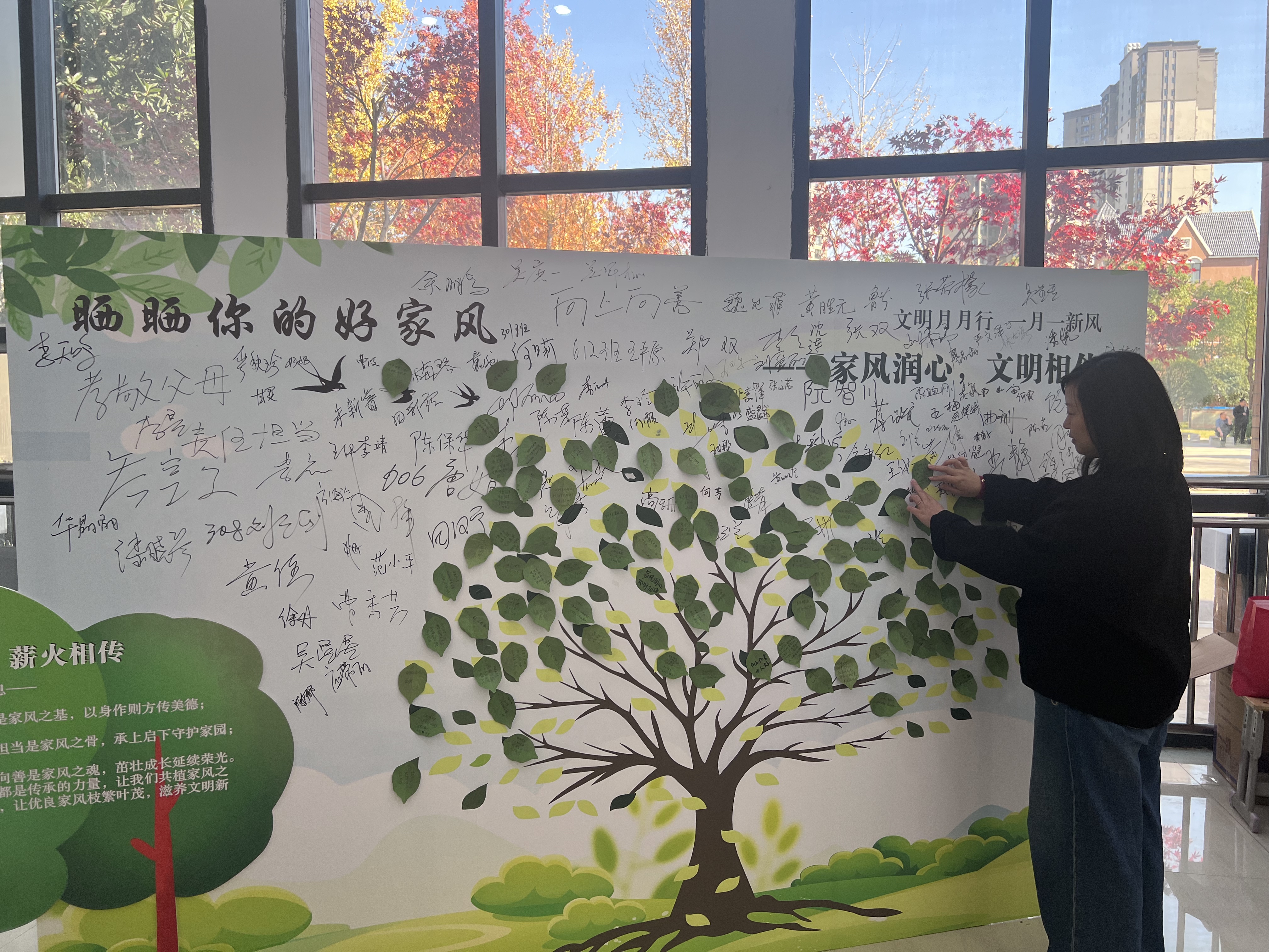 活动尾声,家长们还纷纷在“家风寄语”卡片上写下对文明家庭建设的期望与承诺, 一张张满载深情的卡片,被小心翼翼地贴在现场的 “家风树”上,绿叶映衬下的字迹,既是对家风传承的郑重约定,也是对文明新风的积极践行。